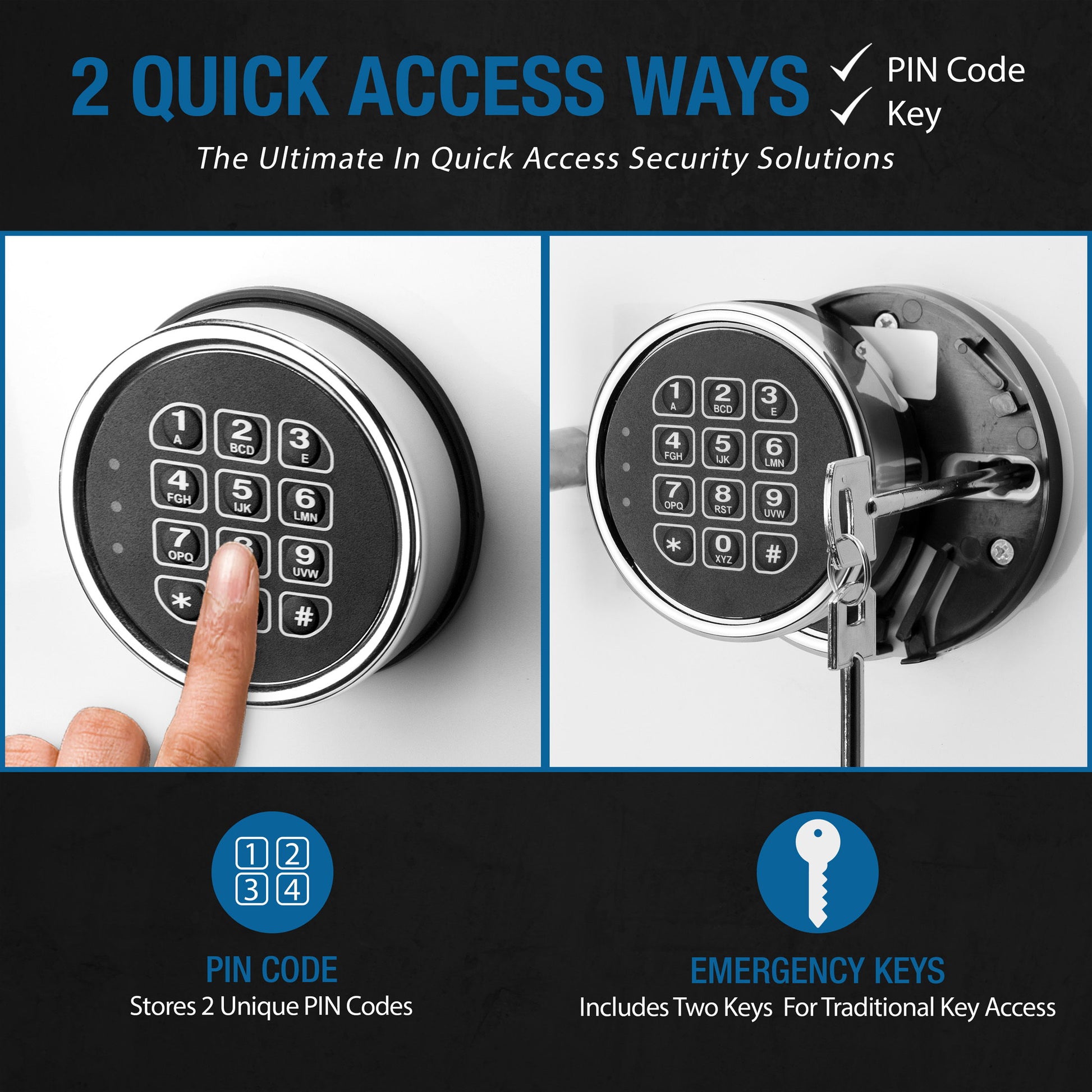 - Advanced Locking Mechanism - Features an electronic keypad lock with a backup key for added security. Users can set a unique PIN code for quick access and receive a low battery warning.