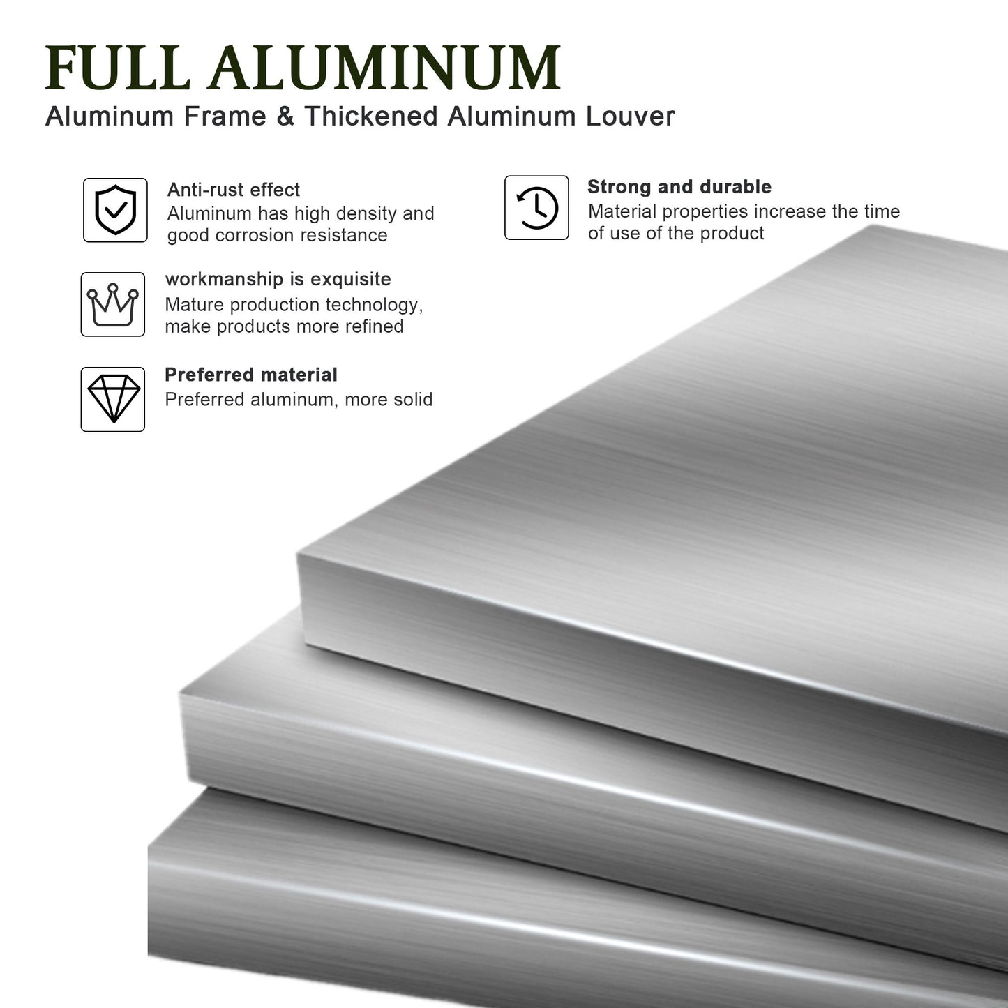 - Premium Material Construction: Made of a powder-coated aluminum frame and aluminum louvers, designed to withstand up to 73 mph winds.