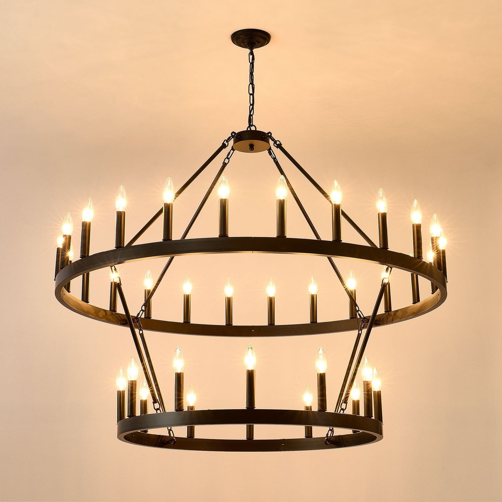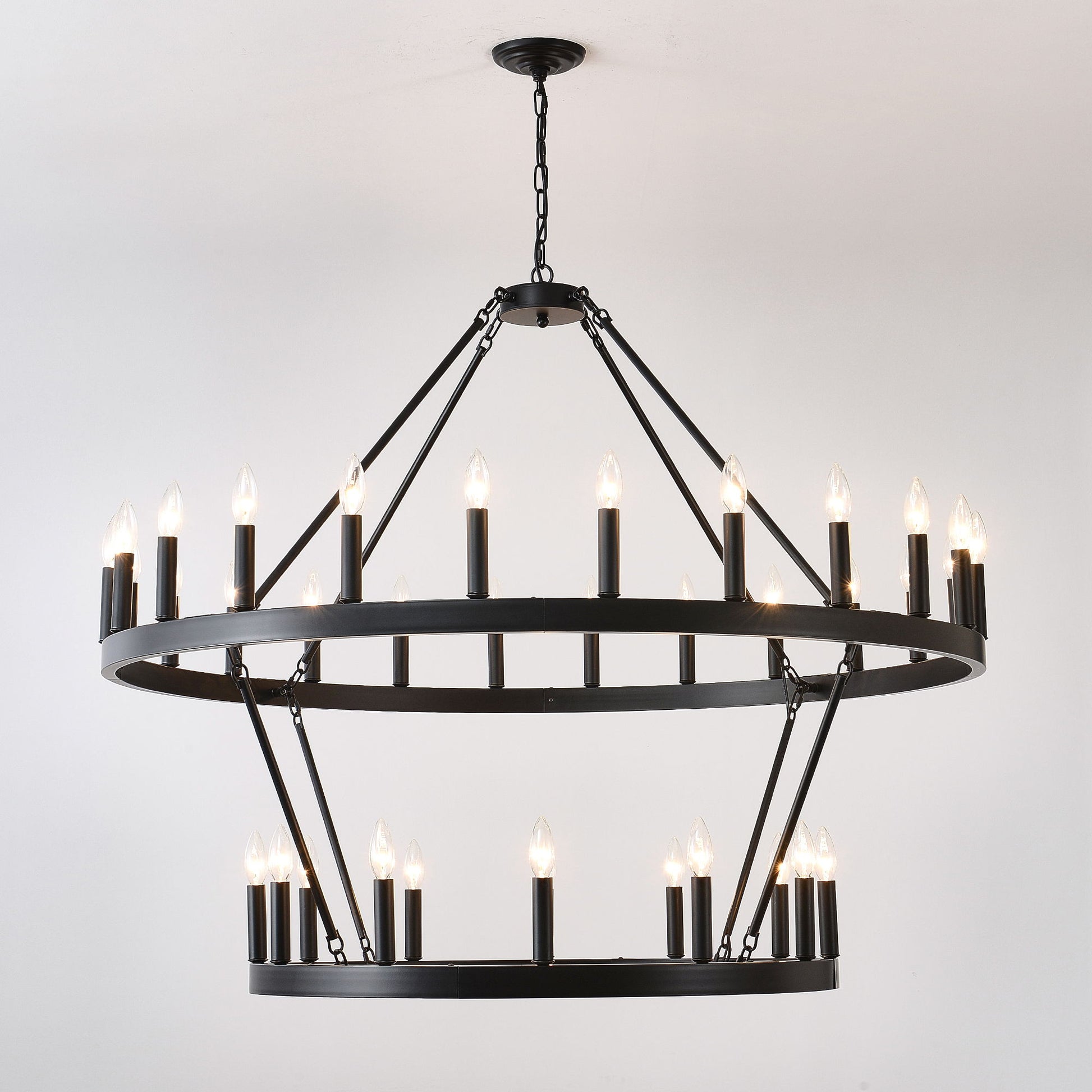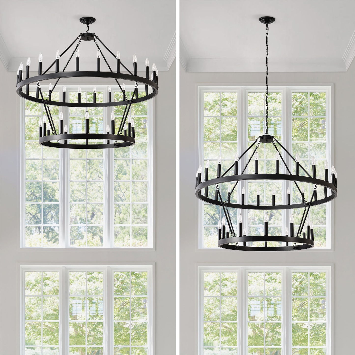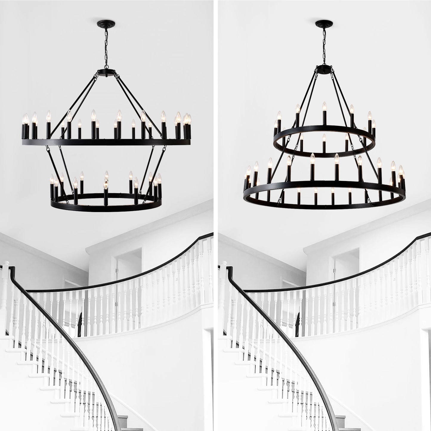 2 Tiers Wagon Wheel Chandelier Wooden Farmhouse 36 Light (24 / 12) Or (12 / 24) Metal Chandeliers 2 Story Light Fixtures Industrial For High Ceiling Living Dining Room Foyer, Adjustable Height - Black