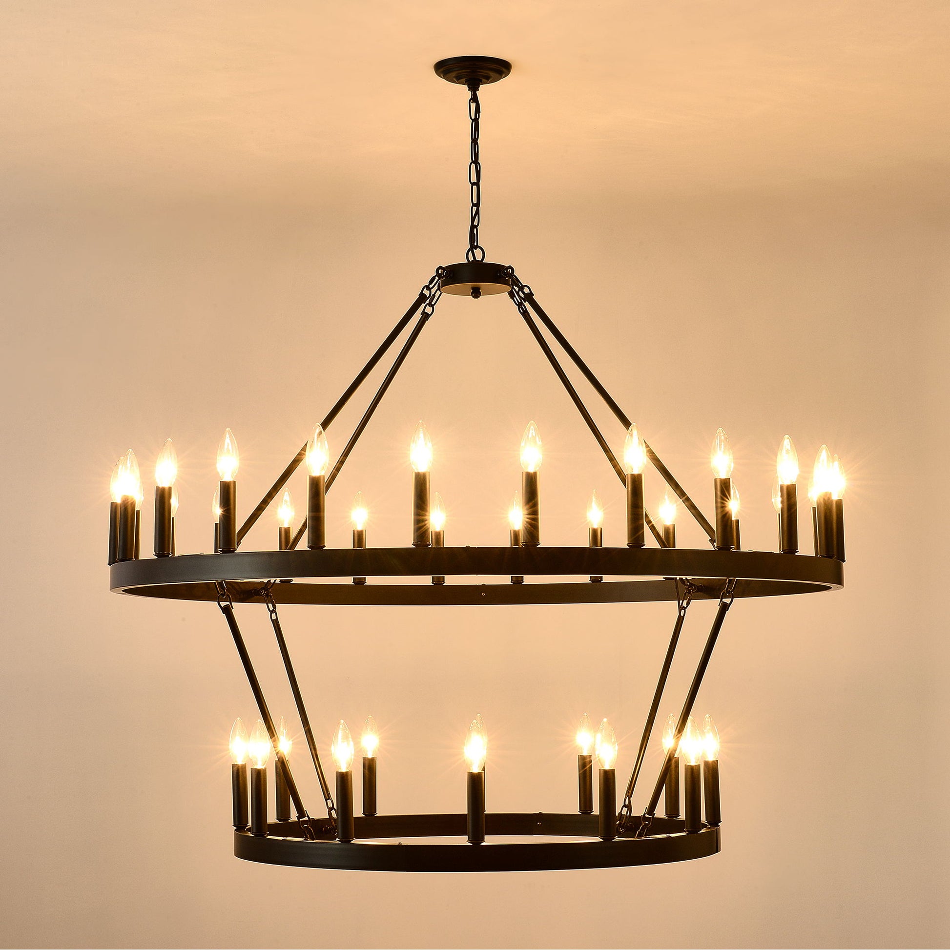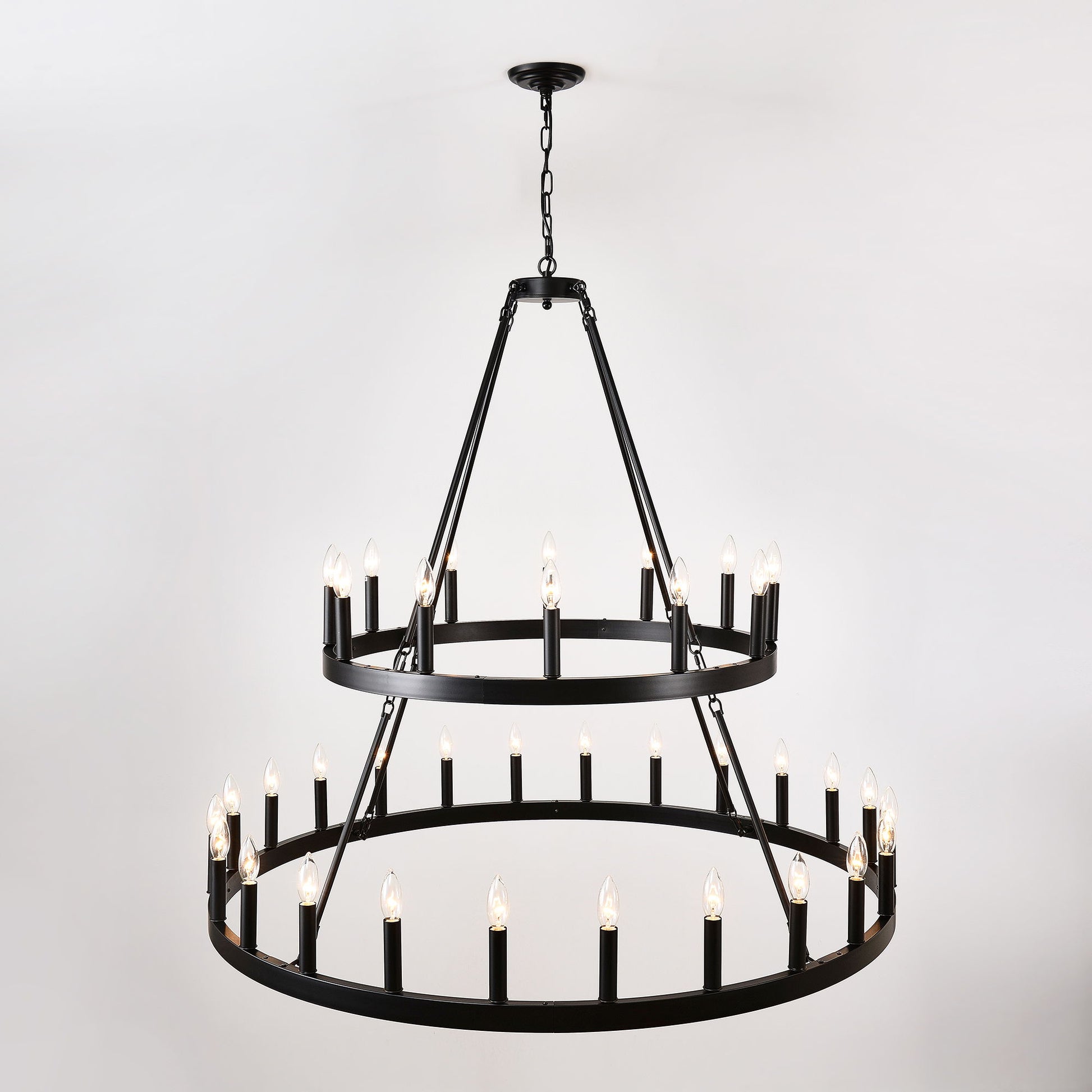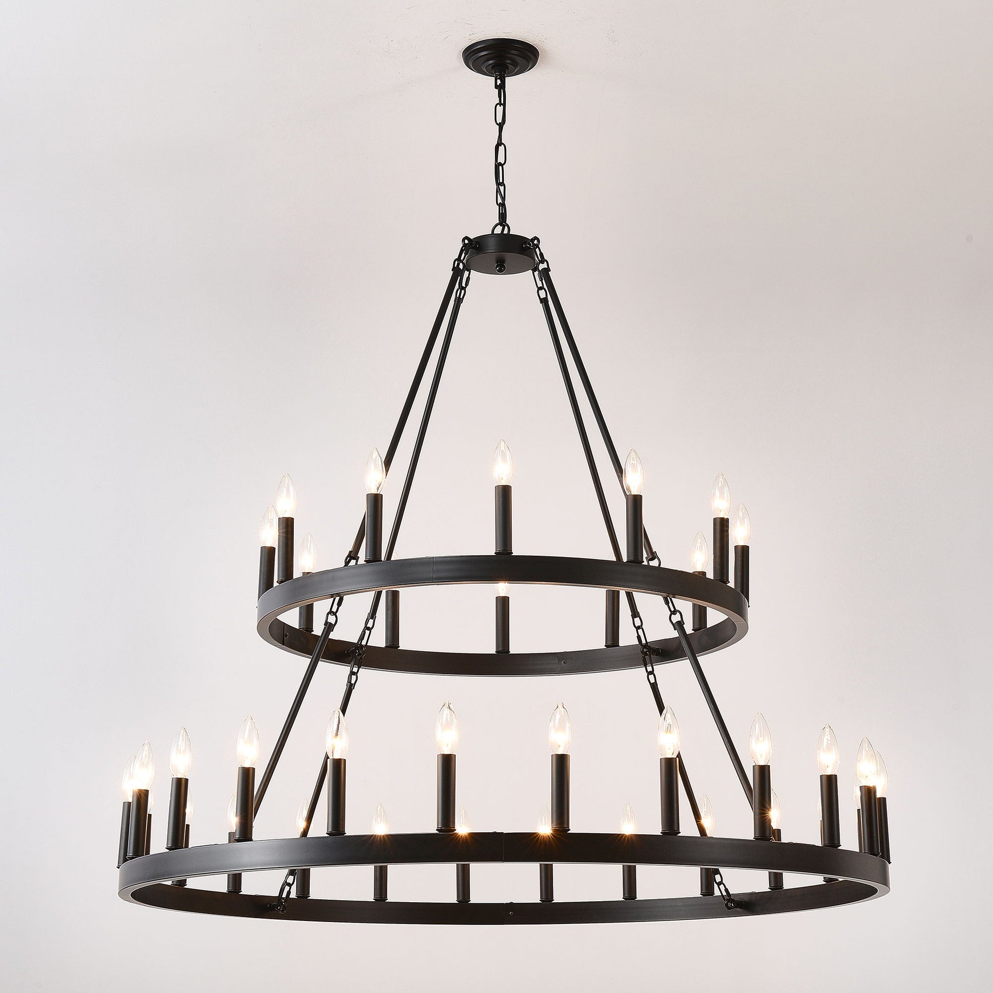 2 Tiers Wagon Wheel Chandelier Wooden Farmhouse 36 Light (24 / 12) Or (12 / 24) Metal Chandeliers 2 Story Light Fixtures Industrial For High Ceiling Living Dining Room Foyer, Adjustable Height - Black