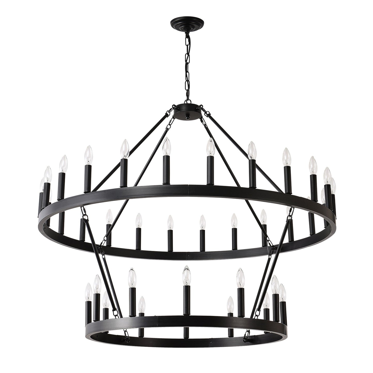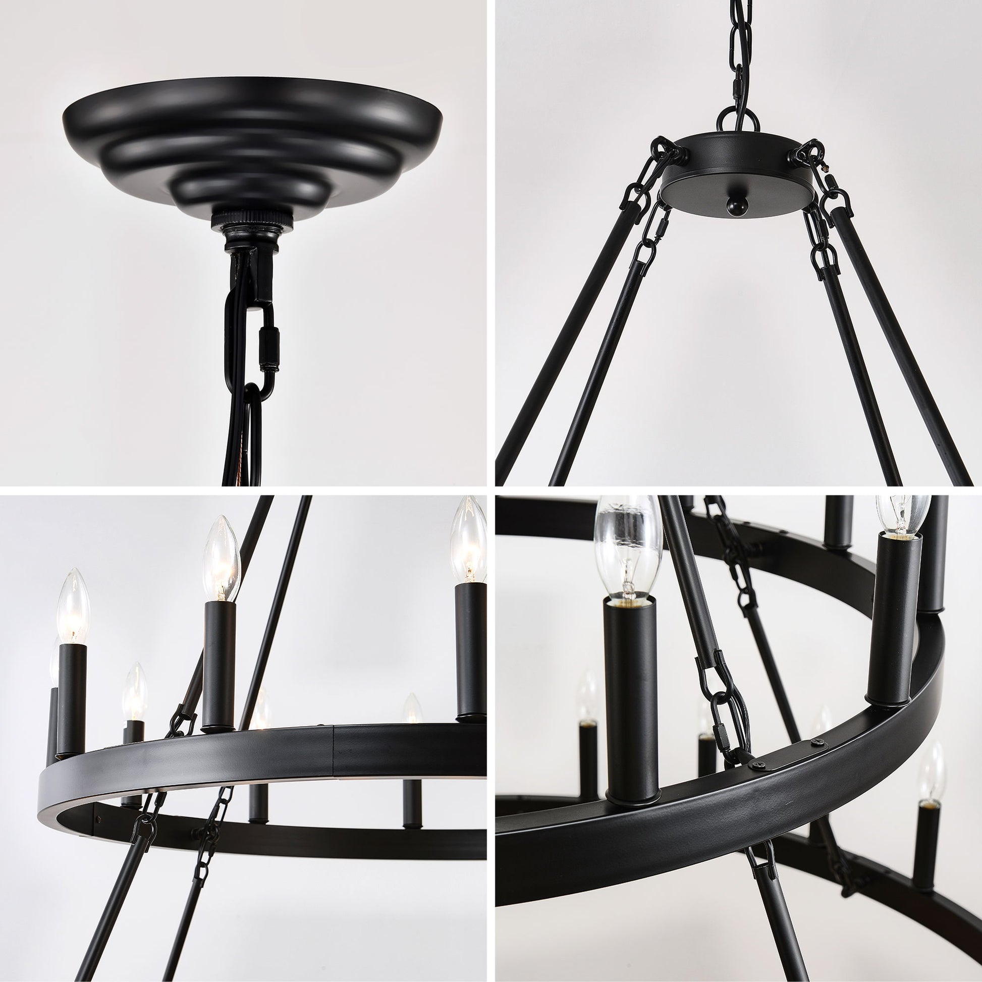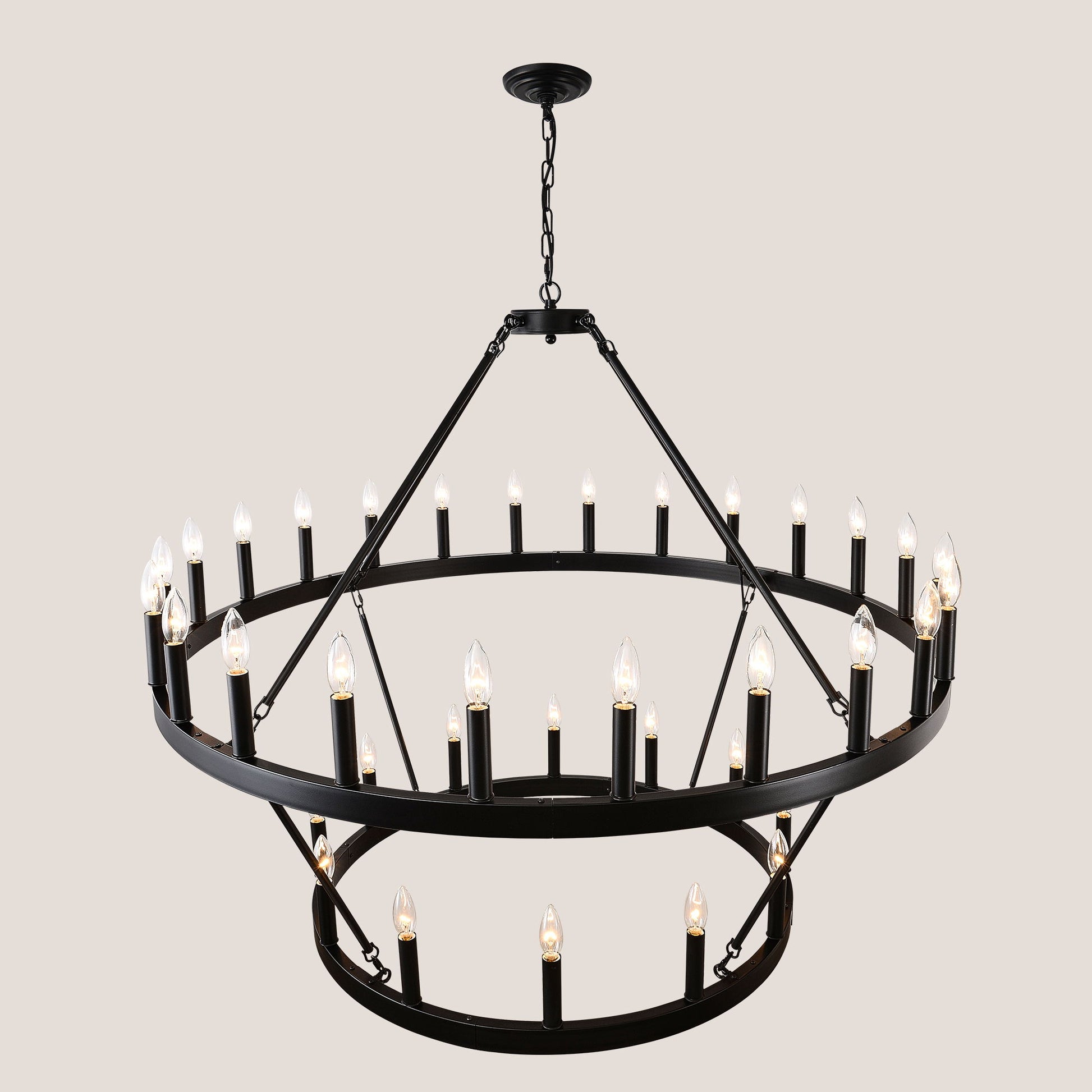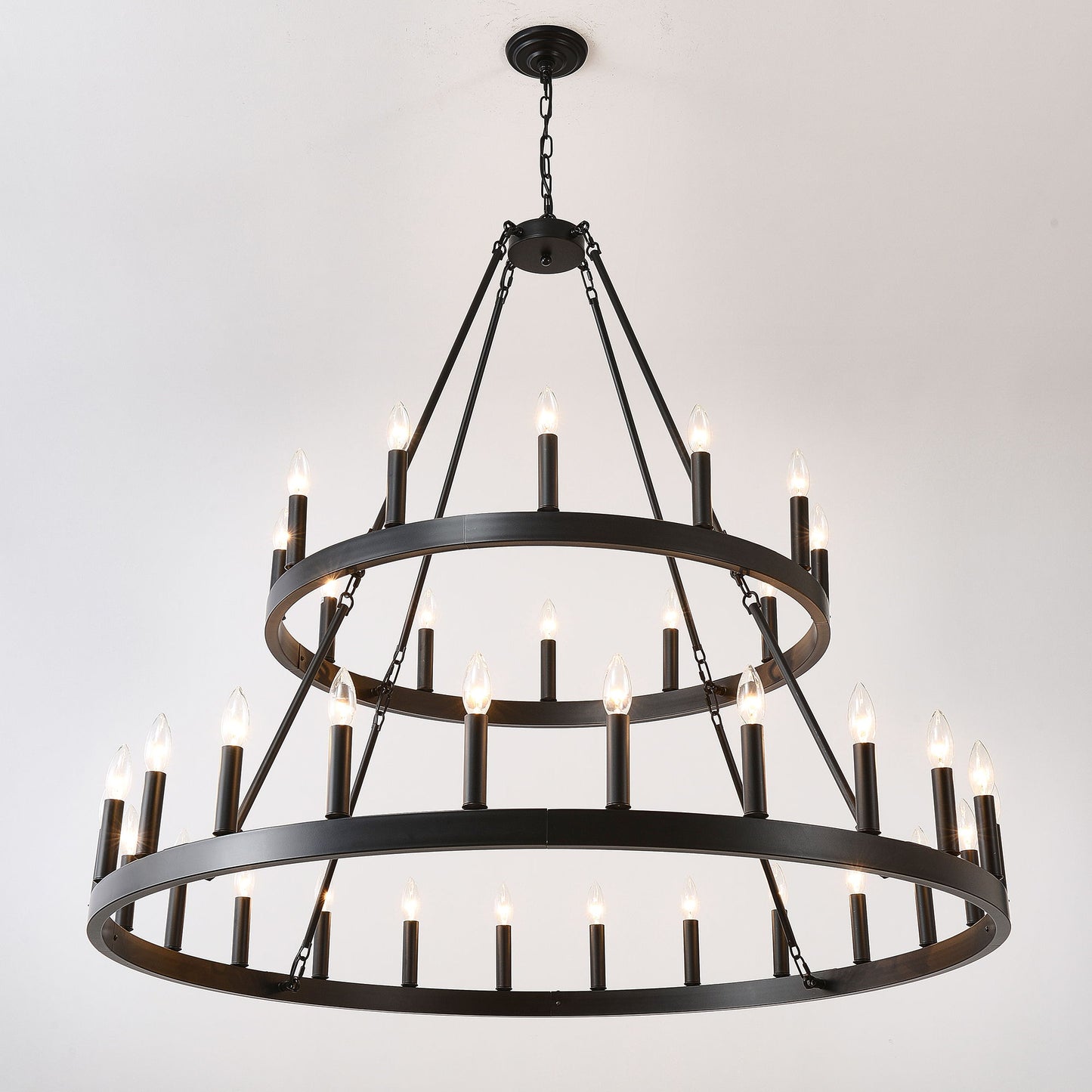 2 Tiers Wagon Wheel Chandelier Wooden Farmhouse 36 Light (24 / 12) Or (12 / 24) Metal Chandeliers 2 Story Light Fixtures Industrial For High Ceiling Living Dining Room Foyer, Adjustable Height - Black