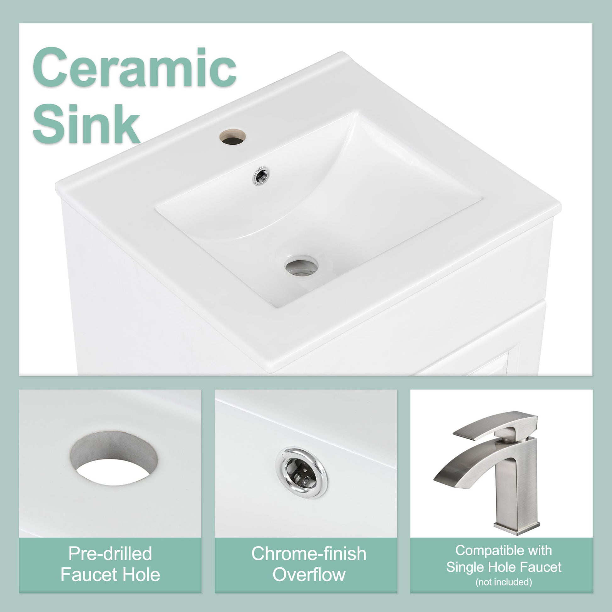 - Ceramic Sink: Features a solid ceramic sink with a smooth, waterproof finish to prevent water stains.