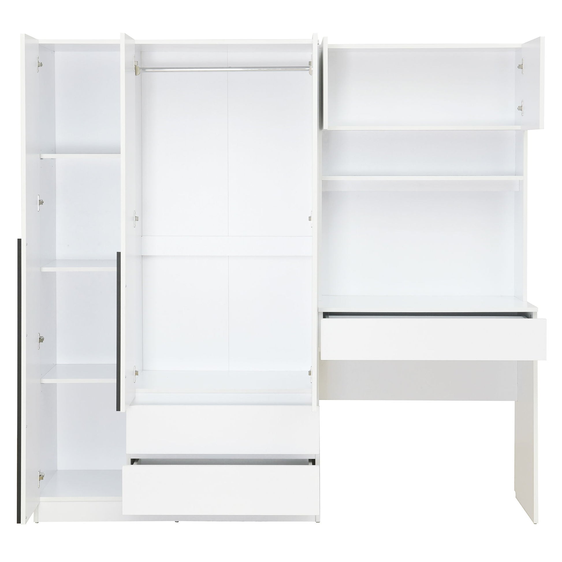 Spacious Storage Space: The left side features a 3-door wardrobe with a built-in hanging rod for easy garment hanging and two storage drawers at the bottom for daily clothing. The right side includes a desk with a top storage cabinet and a lower shelf, along with three storage drawers providing ample space for all your needs.