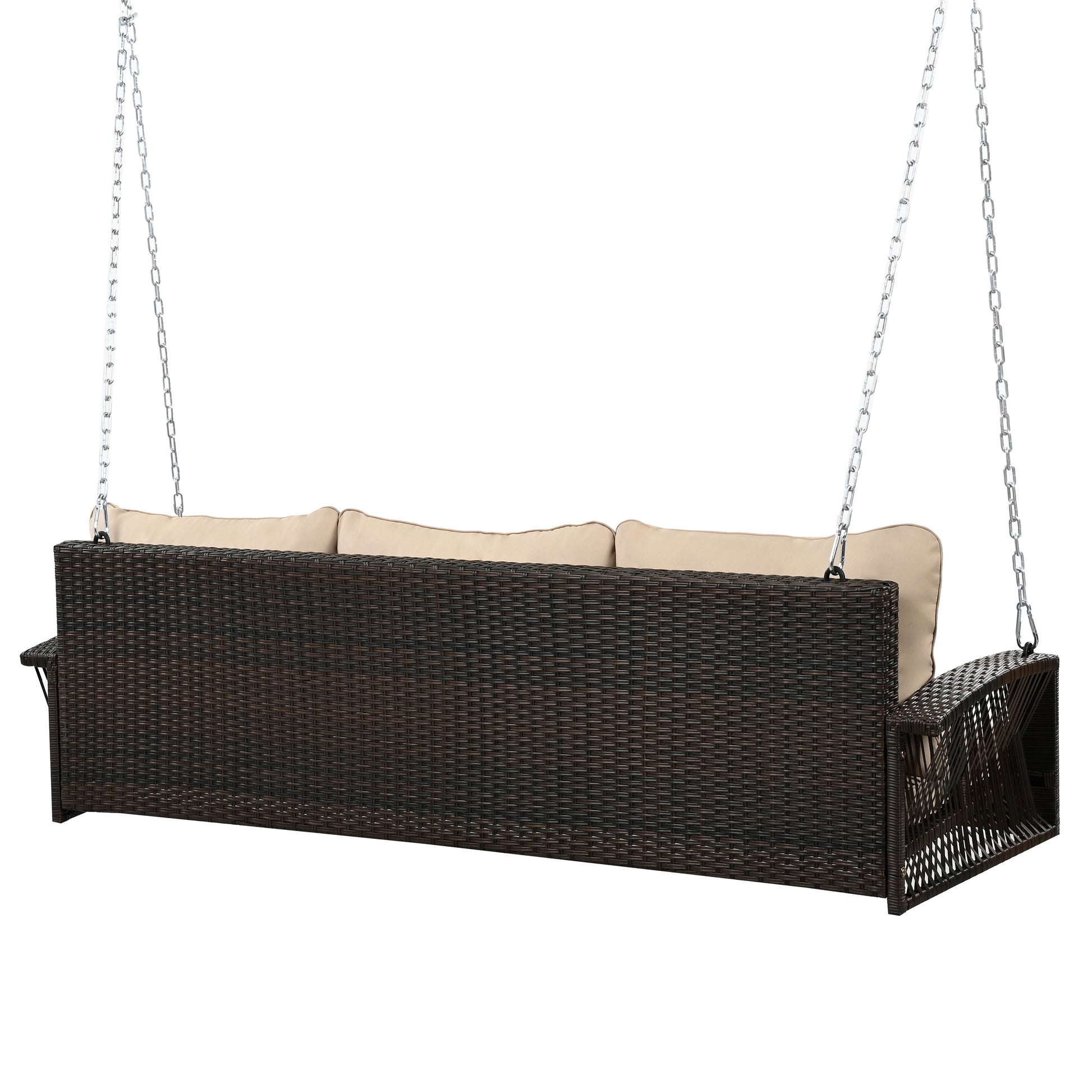 3 Person Porch Swing With Chains, Large Patio Swing Bench With Cushions For Backyard, Garden, And Poolside - Brown