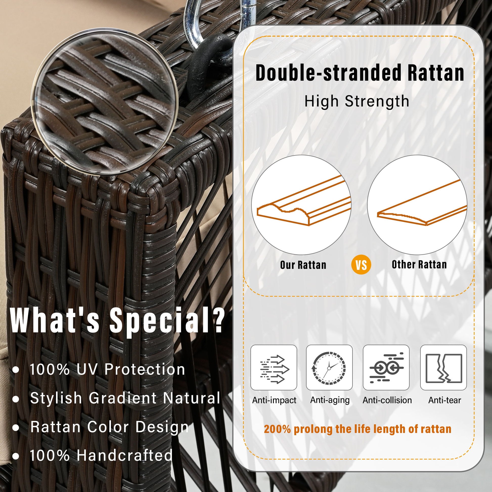 - Enhanced Durability: The double-strand rattan weave increases the swing's durability and wear-resistance compared to traditional single-strand weaving, maintaining its shape and integrity in rain, sun, and wind.