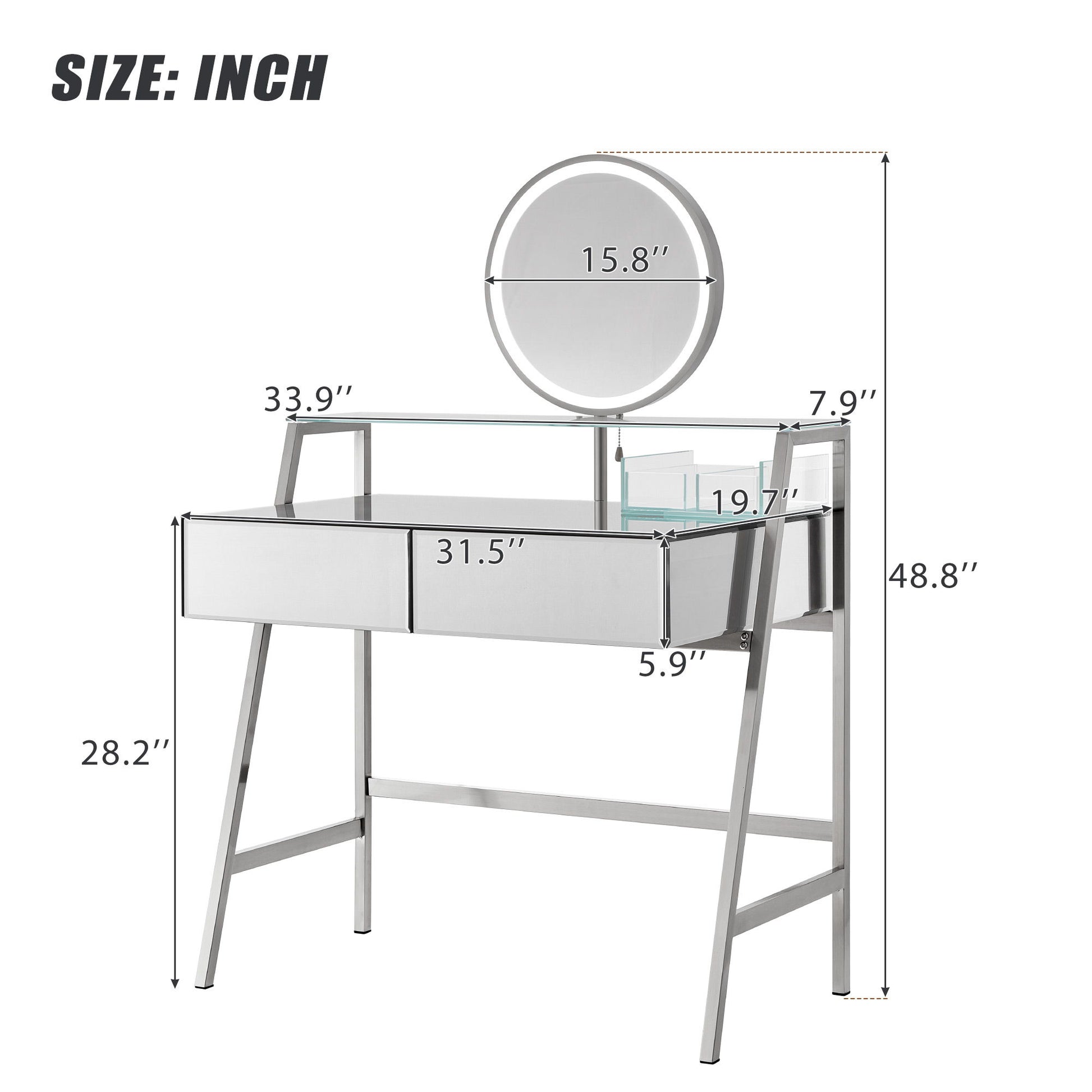 33.9" Mirrored Makeup Vanity Desk With Mirror And Lights, Mirrored Console Vanity Table With 2 Big Drawers & Open Shelf, Dressing Table With Charging Station For Bedroom - Silver