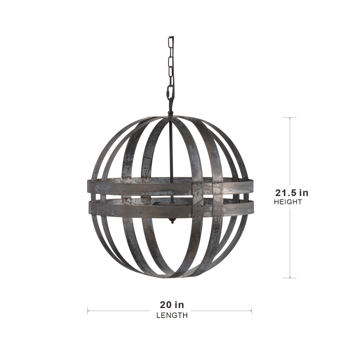 - Design: Urban industrial design featuring antique silver finish and spherical shape made from metal strips.