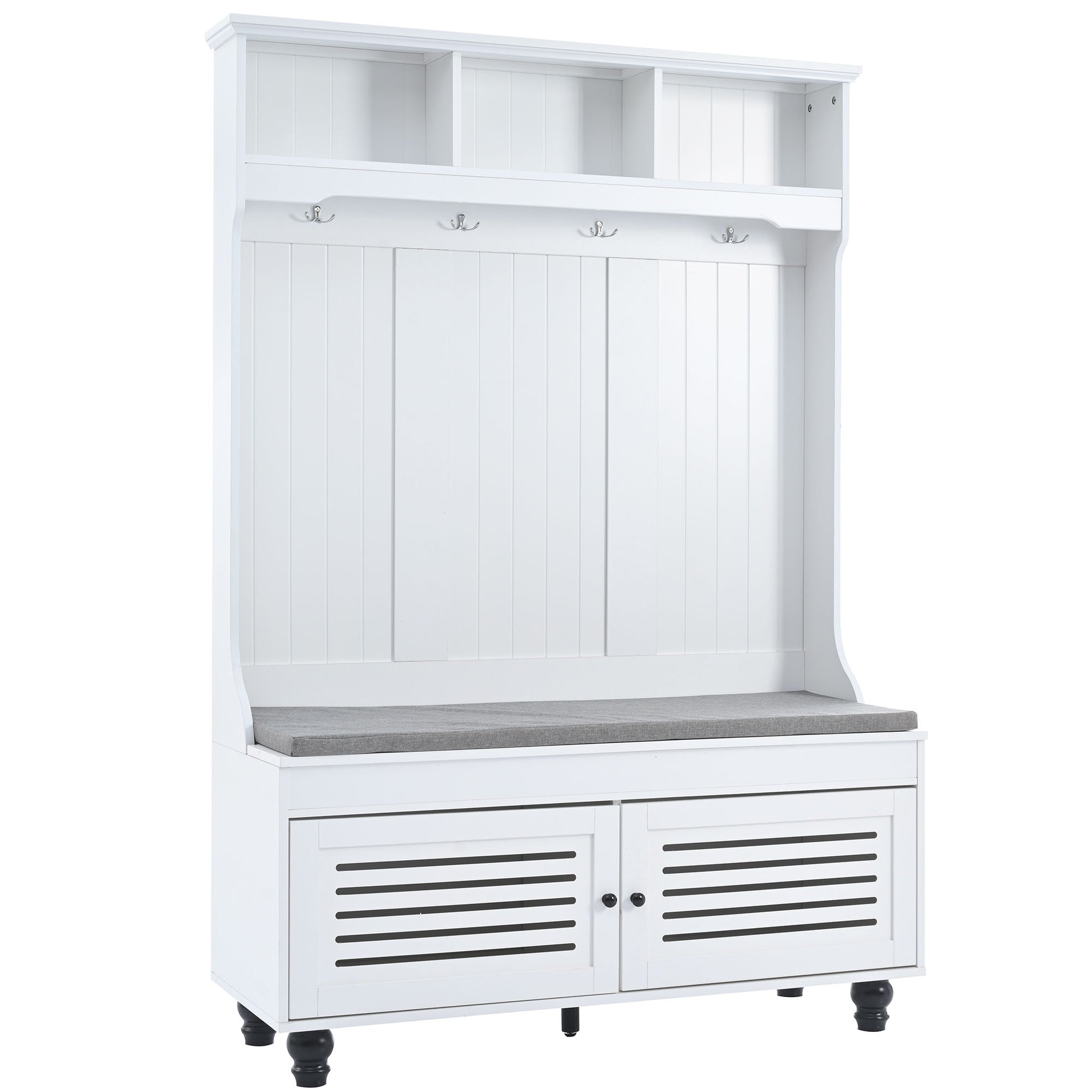 5 In 1 Entryway Bench With Shutter - Shaped Doors, Coat Rack, Cushion And 4 Sturdy Hooks, Wide Hall Tree With Storage Bench For Hallway, Entryway, Living Room - White