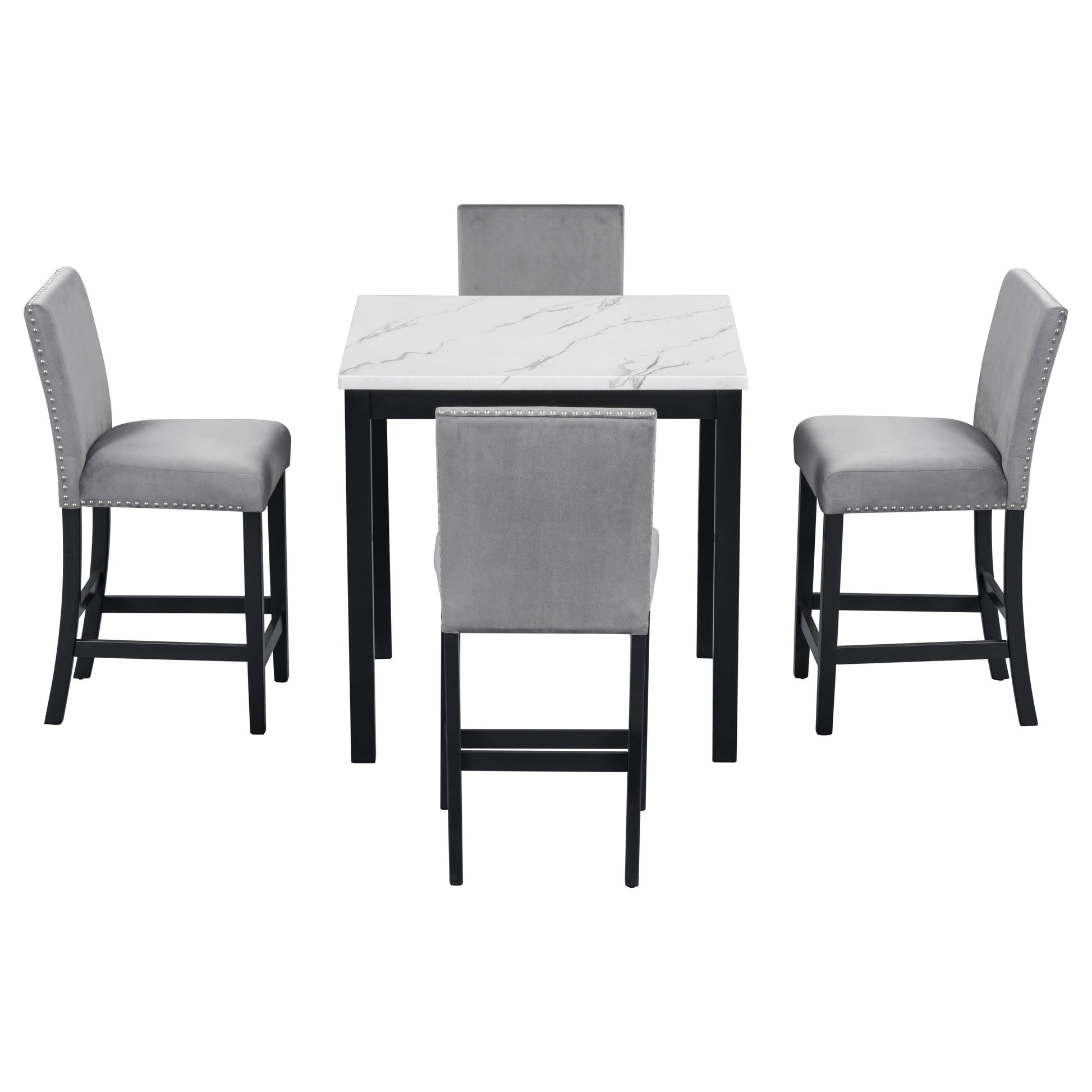 5-Piece Counter Height Dining Table Set With One Faux Marble Top Dining Table And Four Velvet Upholstered Chairs - Gray
