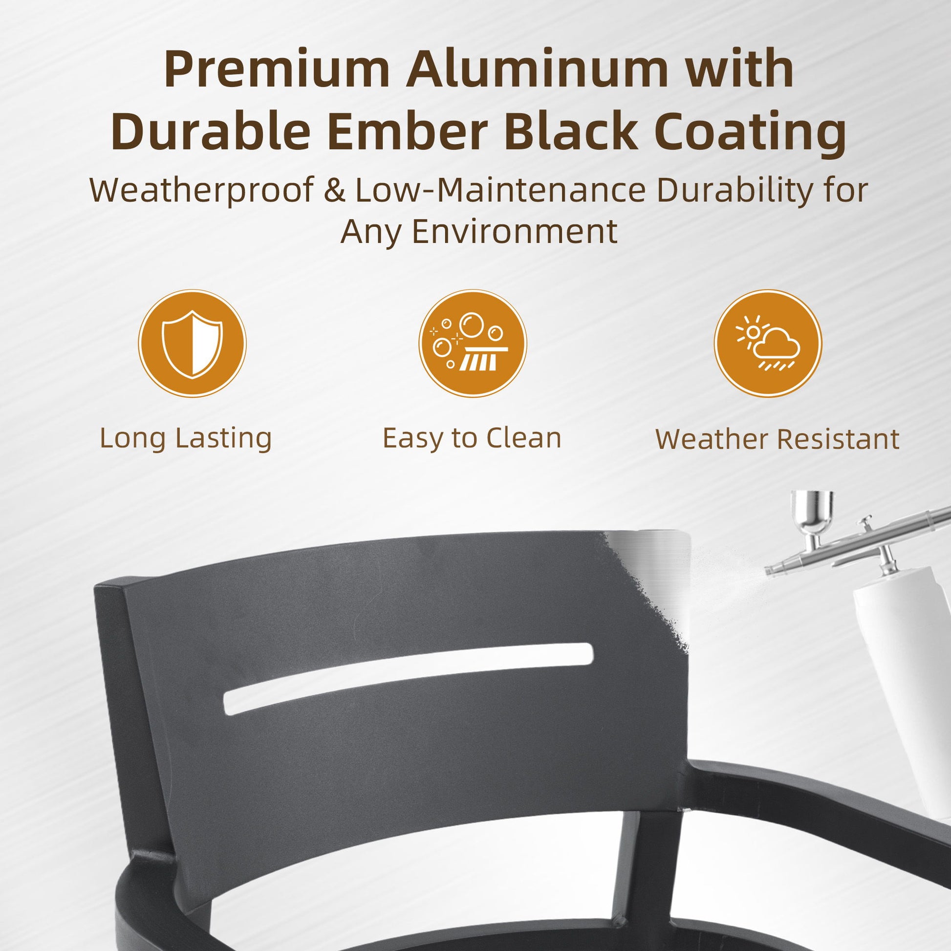 - Elegant Black Sintered Stone Tabletop with Seamless White Veining – Crafted for durability and style, the sleek tabletop pairs beautifully with the heavy-duty, rust-free aluminum base, ensuring long-lasting stability. The Ember Black powder-coated finish.