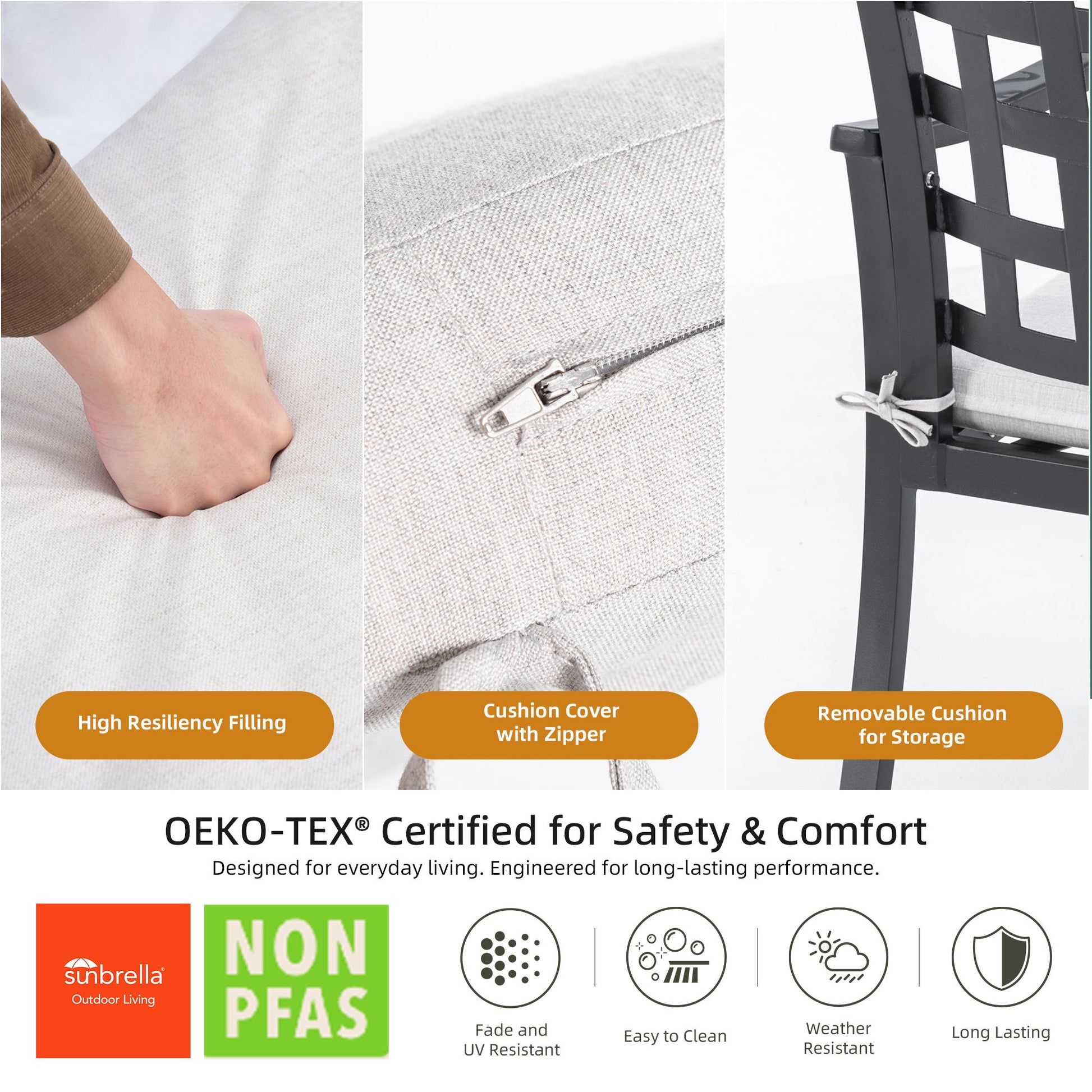 - Weather-Resistant Sunbrella Cushions: Cushions are upholstered in premium Cast Silver Sunbrella fabric - fade, stain, and weather-resistant. Removable covers with high-density foam inserts and zippers offer superior comfort and easy cleaning.