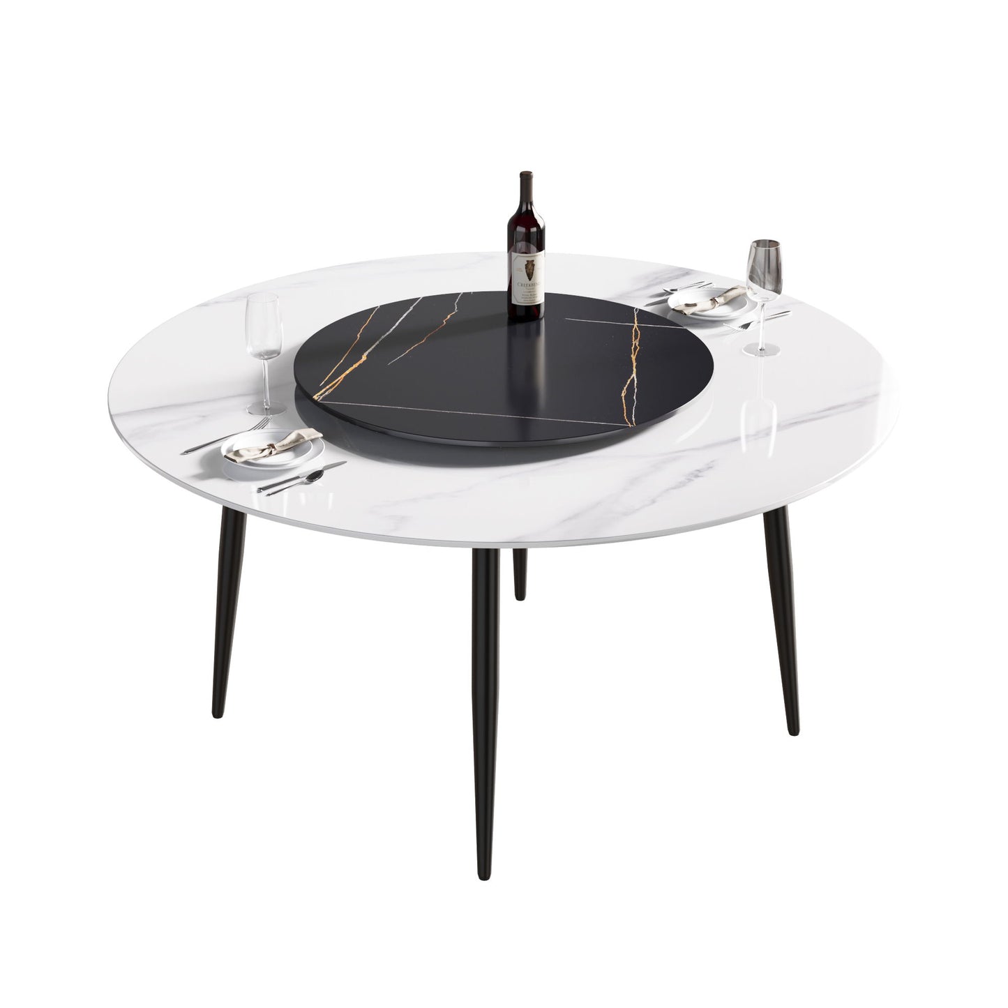 59.05" Modern Artificial Stone Round Metal Dining Table, Can Accommodate 6 People, Artificial Stone Turntable - Black / White