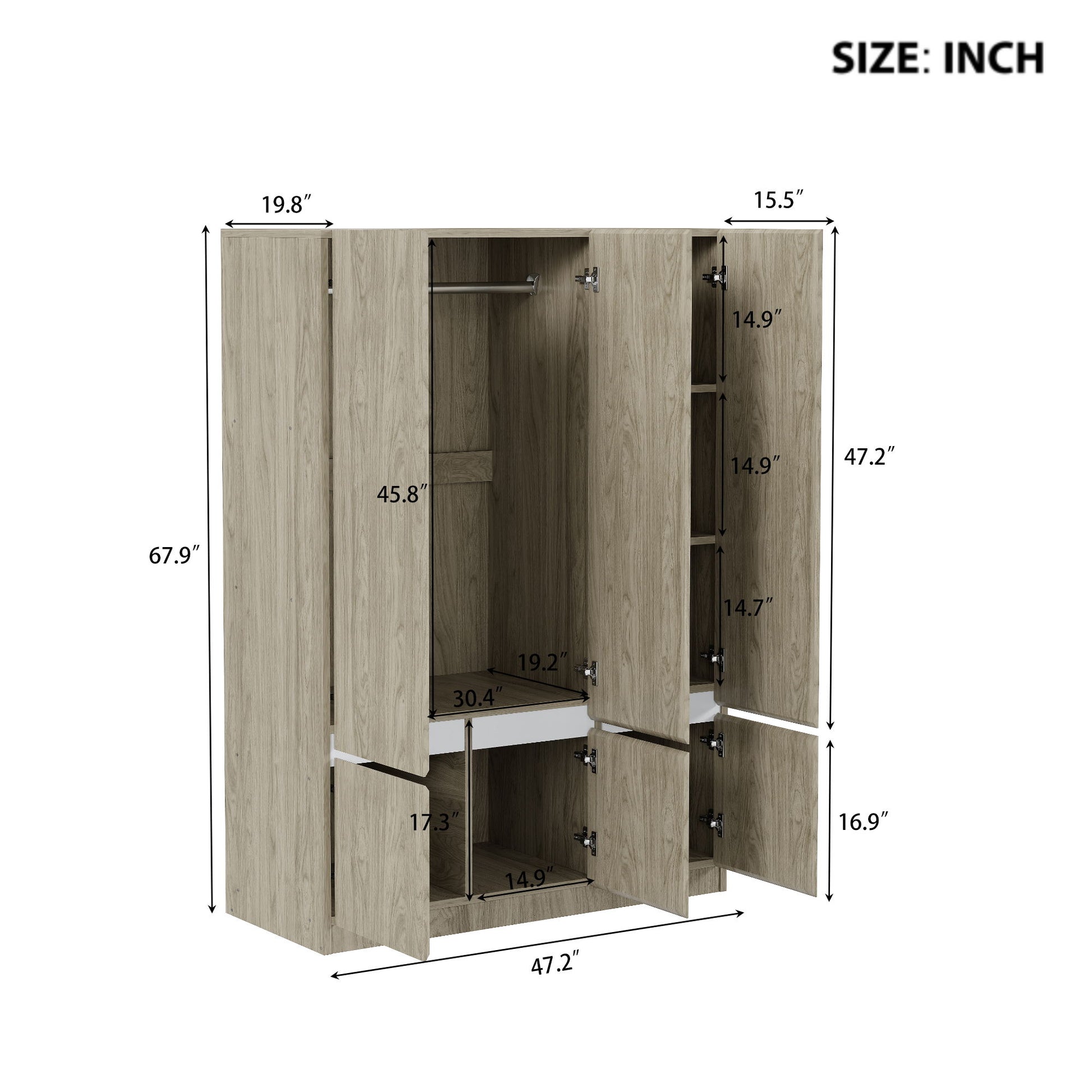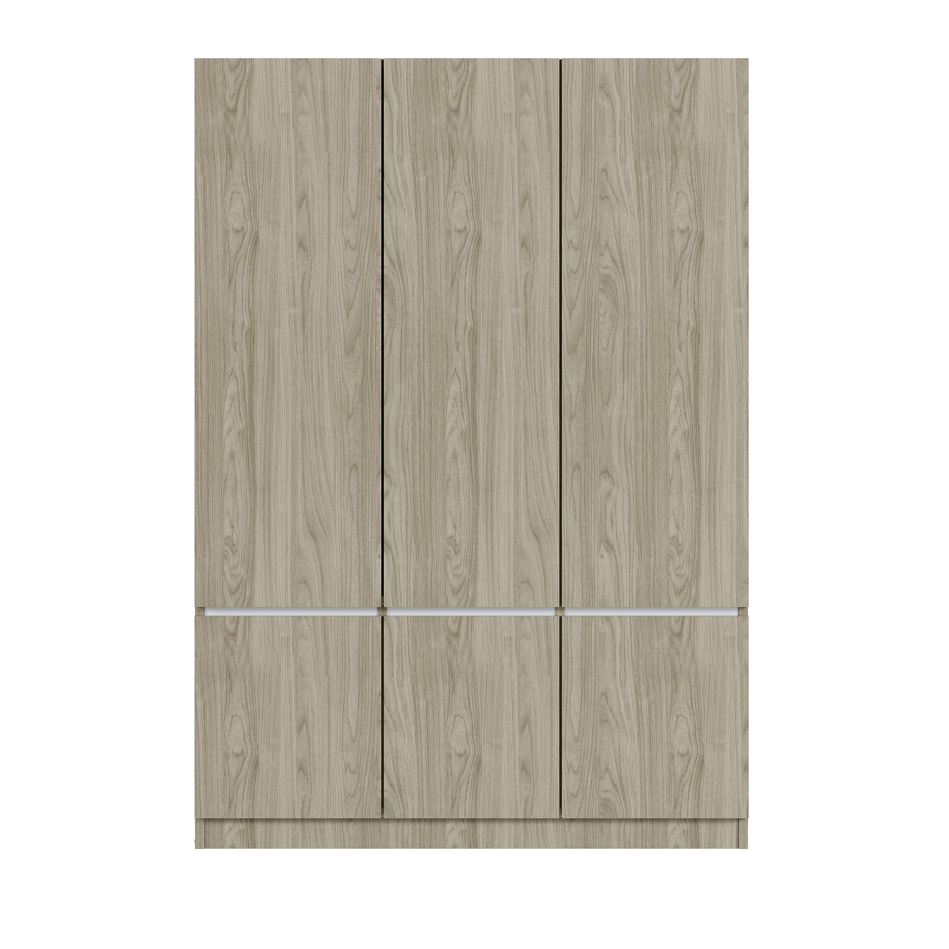 This modern six-door wardrobe is made from high-quality wood and MDF board, ensuring durability and stability. Its simple design features three large doors and three small doors, with a built-in hanging rail. The upper section includes three independent storage spaces, providing a total of seven storage compartments to meet various needs. Available in white and natural wood colors, each shelf, hanging rail, and drawer can support up to 15 kg, ensuring safety and reliability.
