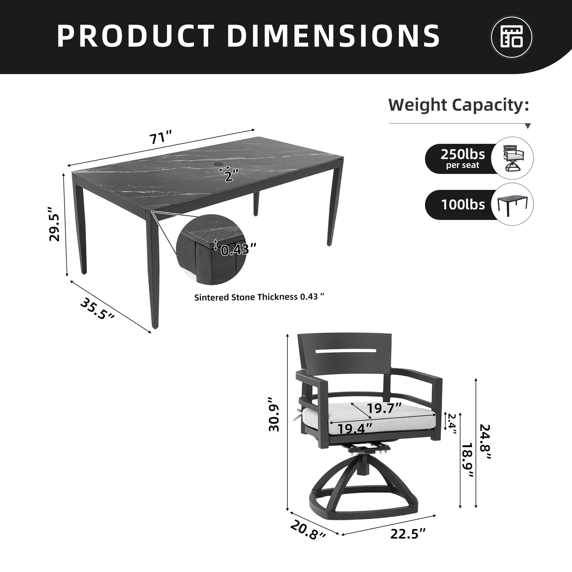 7 Pieces Modern Outdoor Patio Dining Set, Rectangular Dining Table, 6 Swivel Rockers With Sunbrella Cushions - Ember Black
