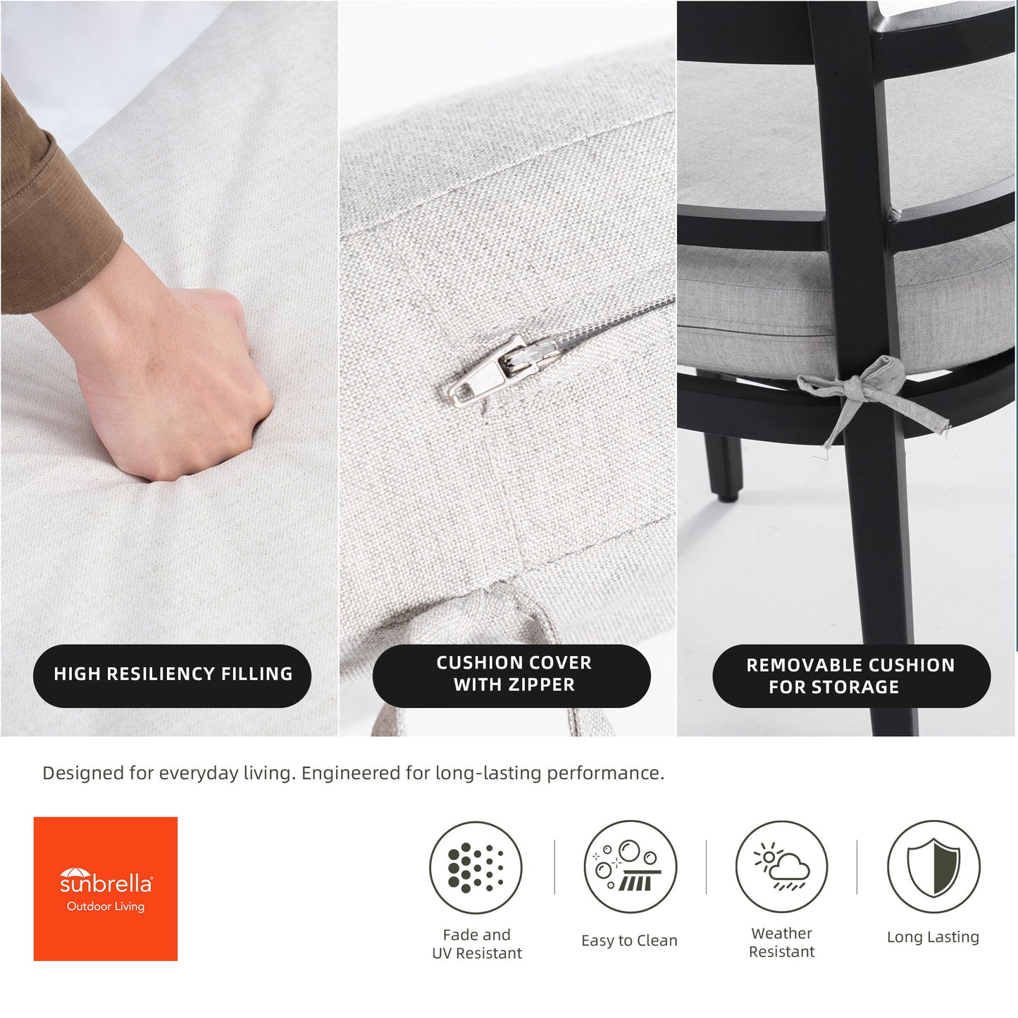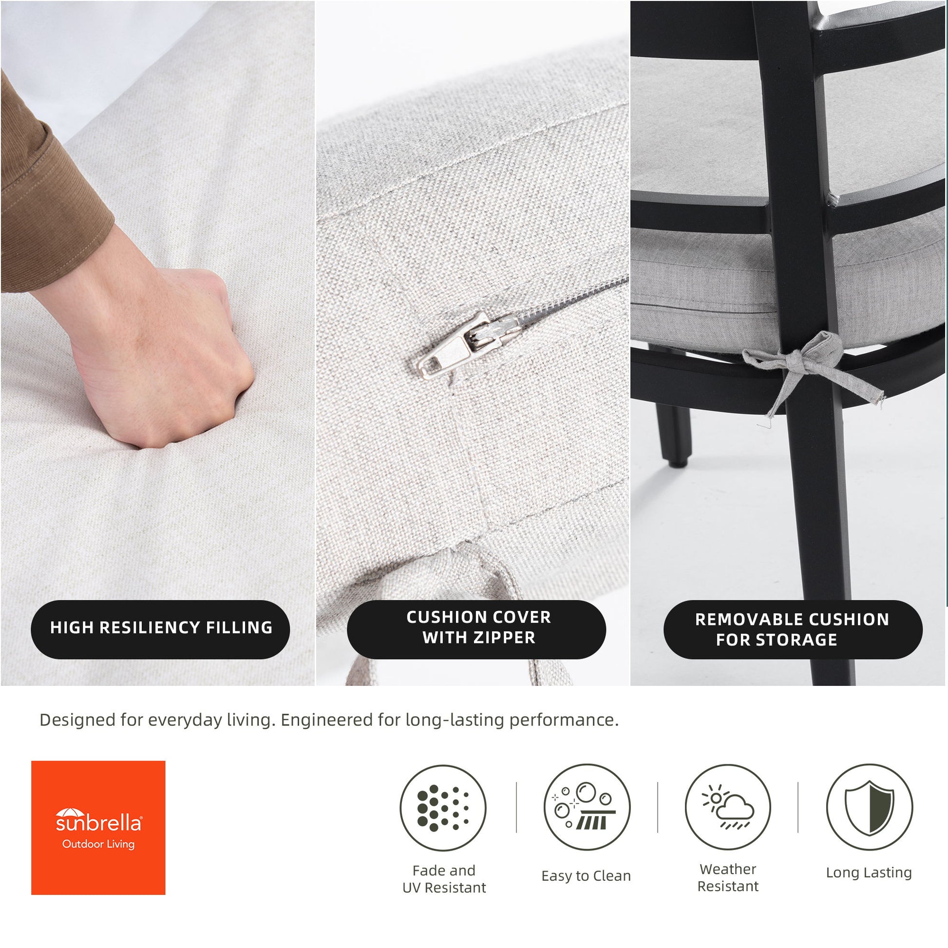 - Sunbrella Cushion Excellence: Cushions are upholstered in Cast Silver Sunbrella fabric - renowned for fade and stain resistance; With removable straps, zippered covers, and high-density foam, they provide superior comfort and easy maintenance.