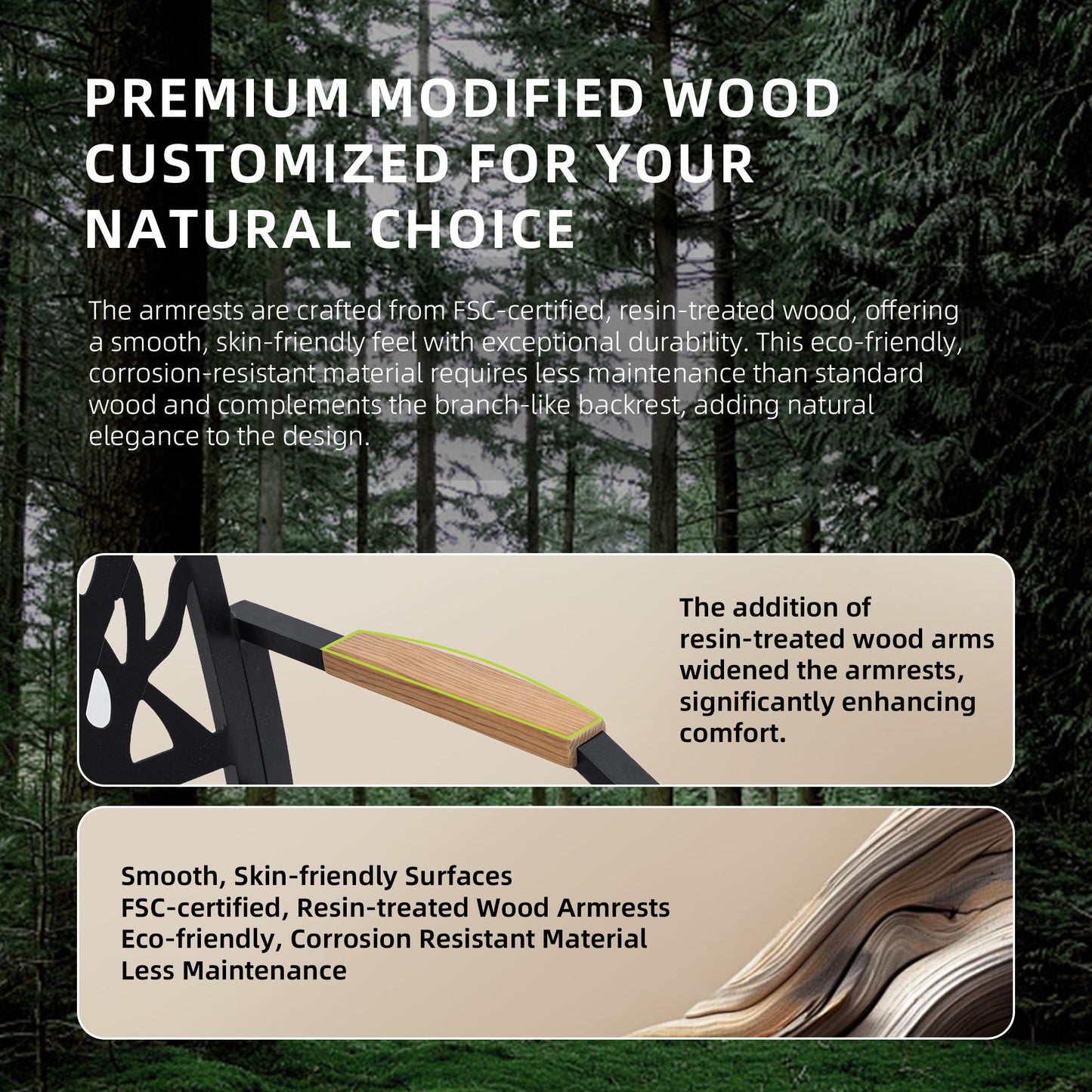 - Nature-Inspired Chair Design: Dining chairs showcase a branch-like backrest with organic cutout detailing, paired with FSC-certified, resin-treated wood armrests for a stylish and comfortable touch.