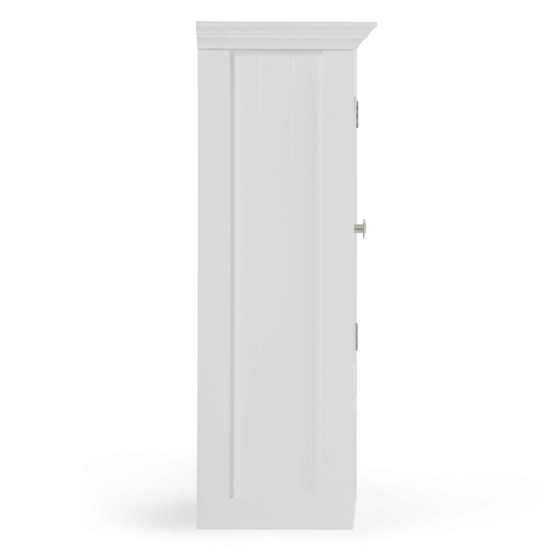 - Features two (2) doors with two (2) adjustable interior shelves and one (1) open bottom shelf. Brushed nickel hardware