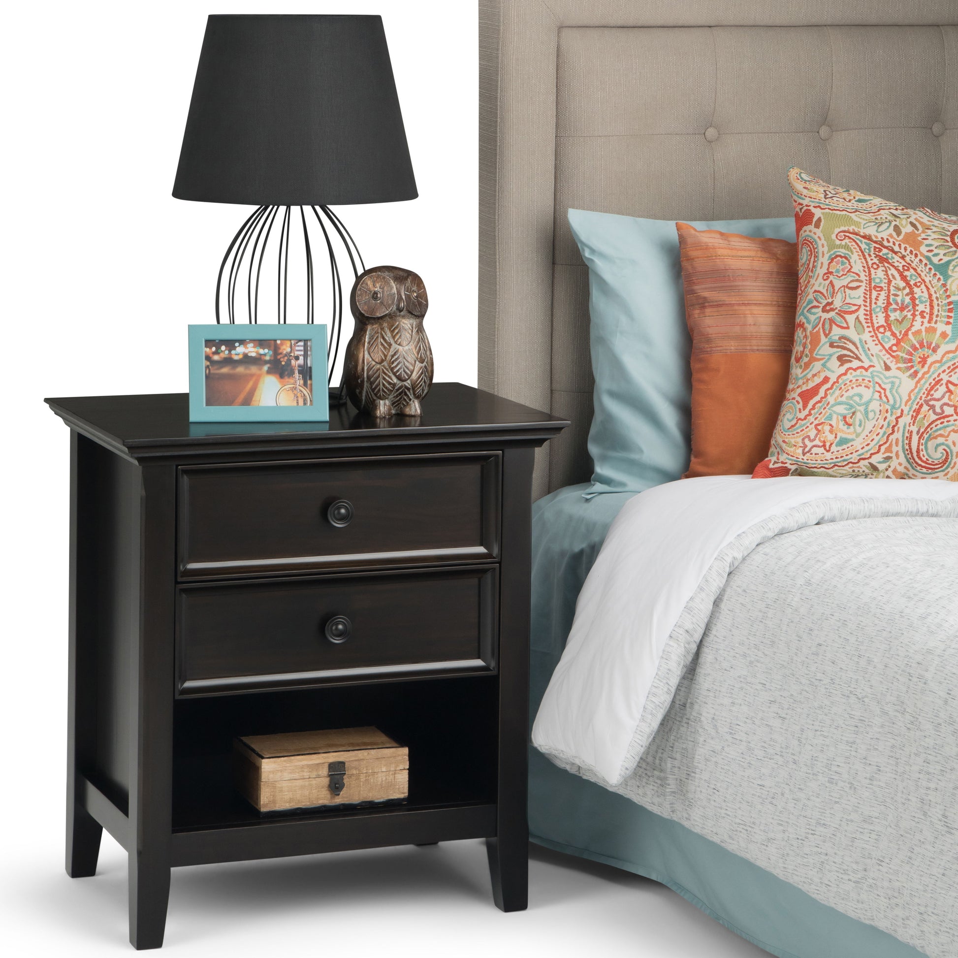 - Features two (2) spacious drawers with metal drawer glides and open bottom storage area