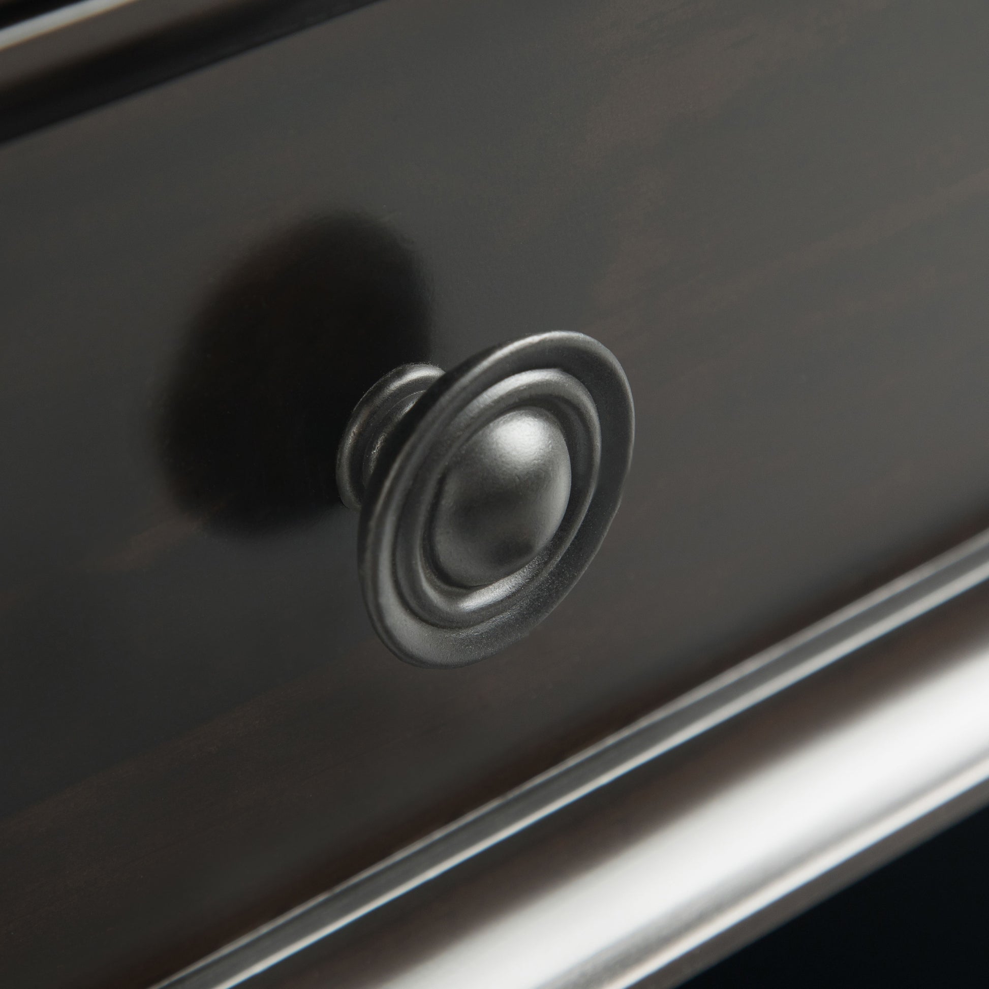 - Transitional design includes tapered legs, molded crown edged table top, panel framed drawer fronts and bronze round decorative pulls