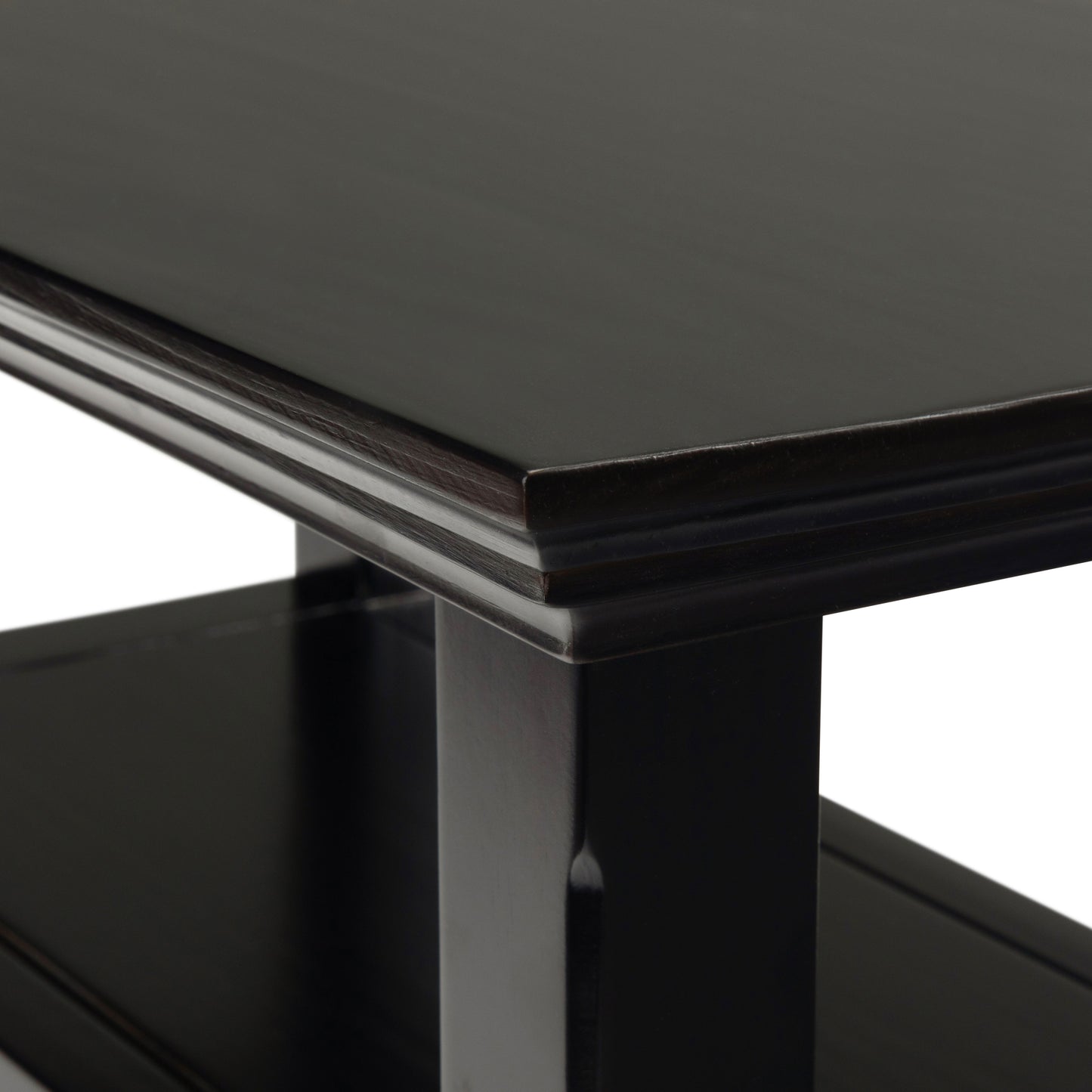 - Transitional design includes tapered legs, molded crown edged table top, panel framed drawer fronts and antique bronze round decorative knobs
