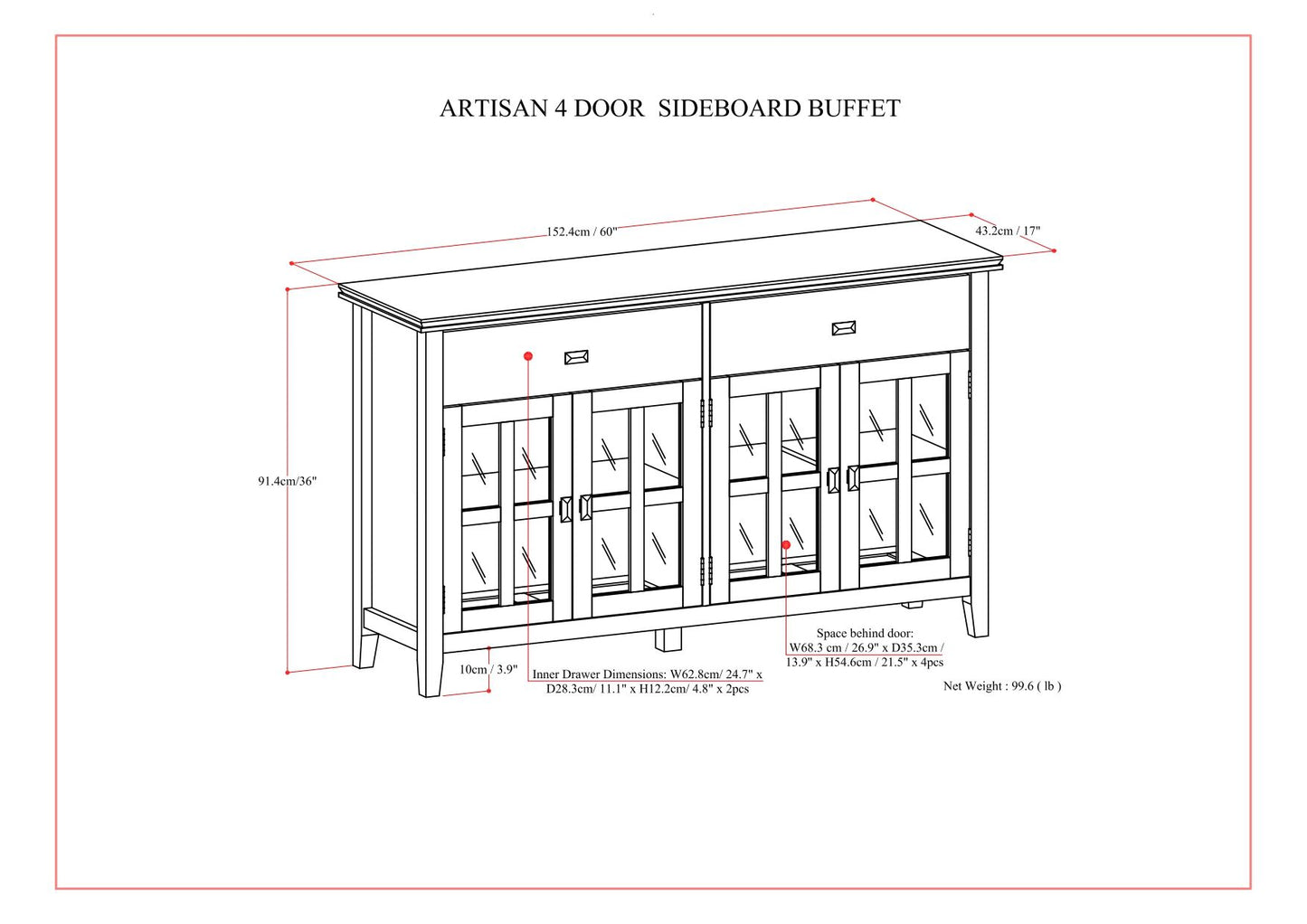 - Features two (2) top drawers with sturdy ball-bearing metal drawer glides for smooth drawer movement, and four (4) doors with tempered glass that open to large storage spaces with one (1) shelf each