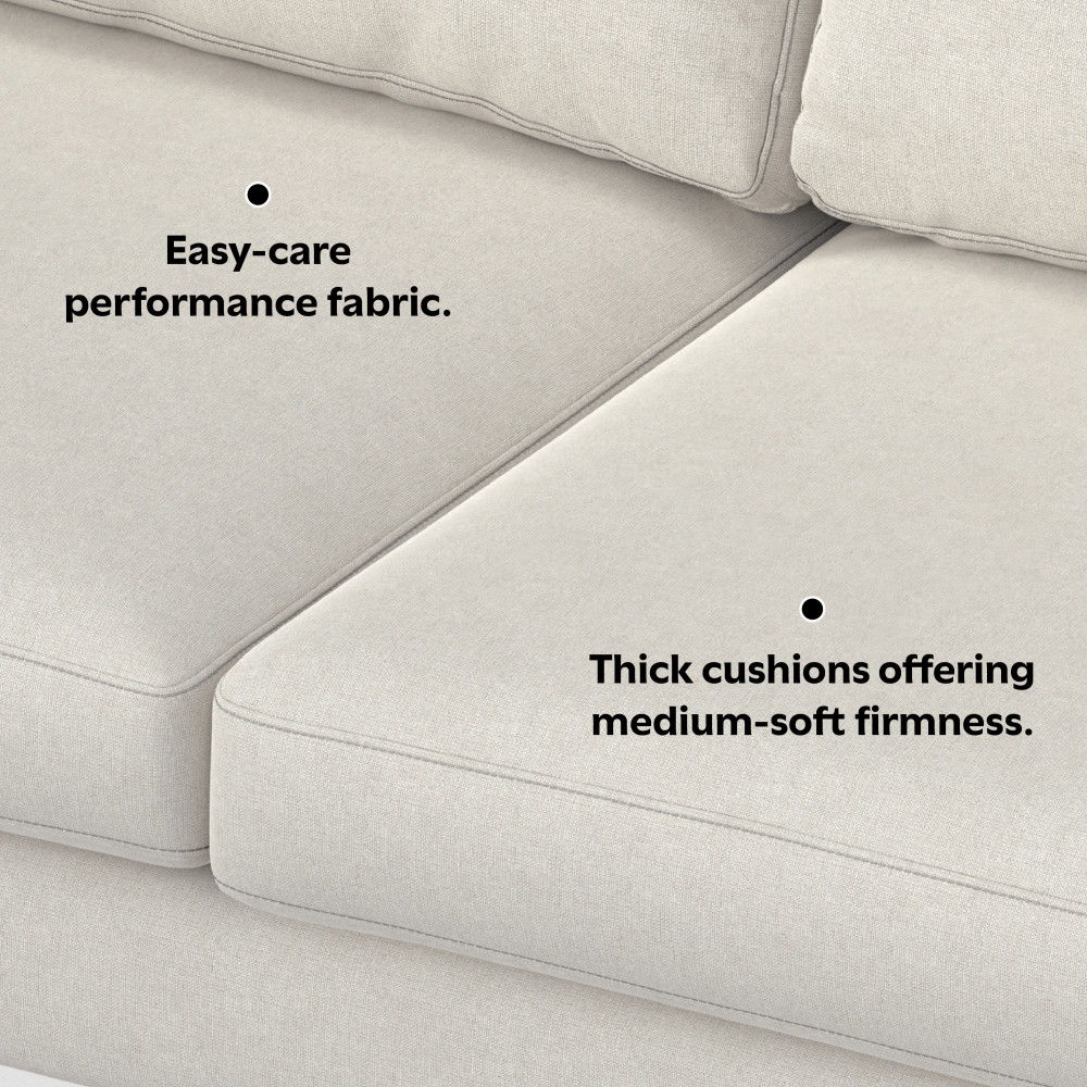 - Upholstered in Cream Performance Fabric, a soft yet durable, easy-to-clean, and stain-repellent fabric made with 100% recycled polyester and protected with water-repellent and fire-resistant coatings; this eco-friendly fabric meets the Global Recycled Standard and OEKO-TEX® STANDARD 100.