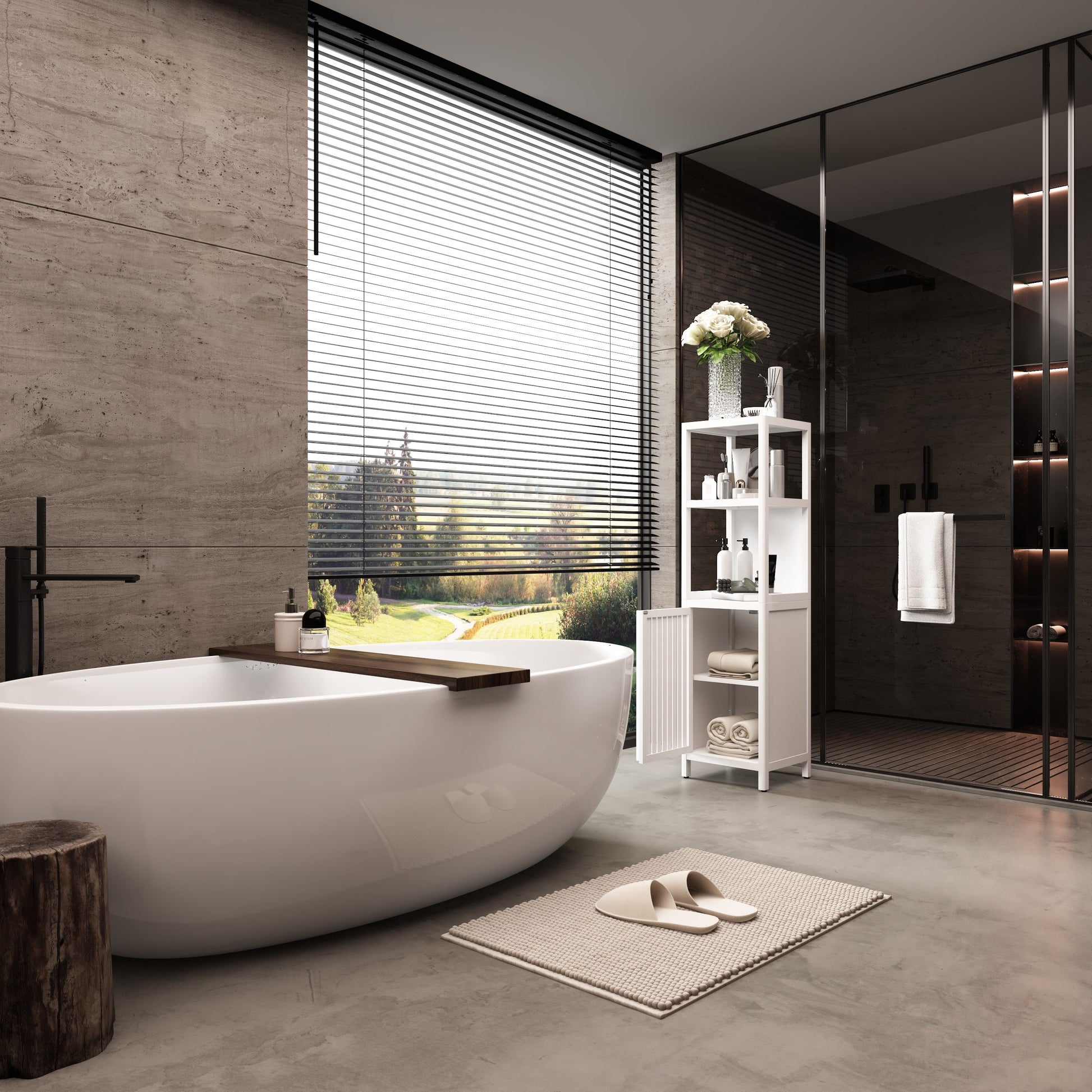 Bamboo Storage Cabinet With Tall Linen Tower, Multi Functional For Bathroom And Living Spaces - White