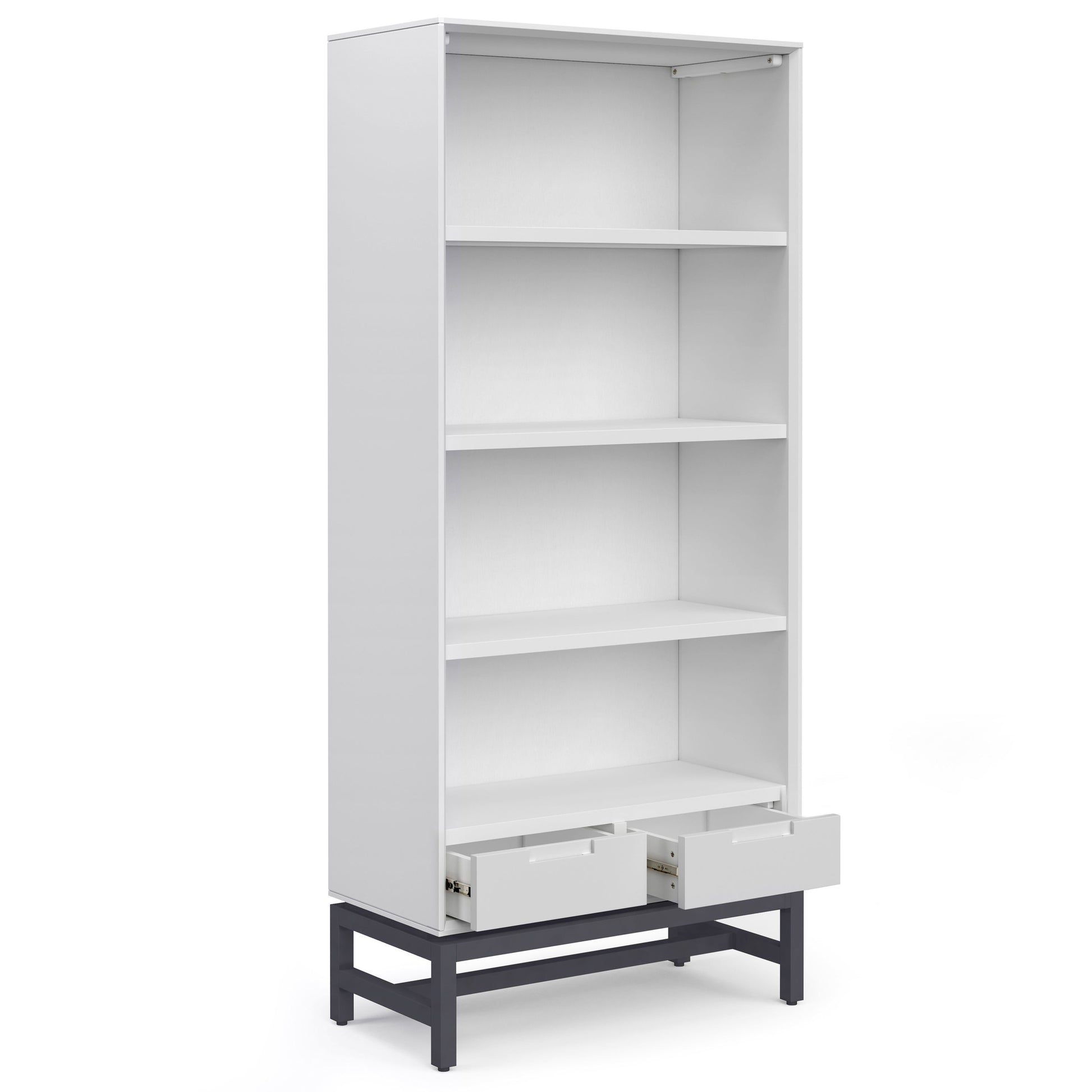 - Features two adjustable shelves, one fixed shelf with 2 small drawers on a metal frame and legs in Graphite Grey