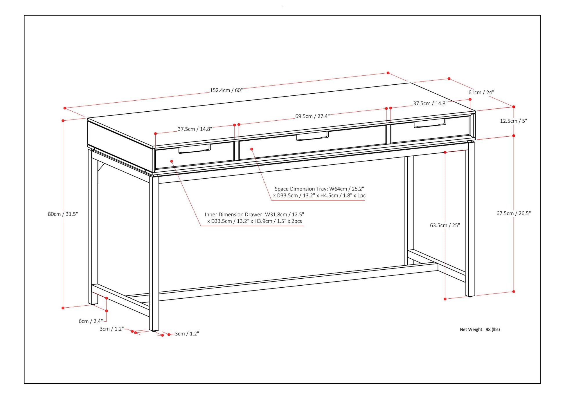 - Dimensions: 24" d x 60" w x 31.5" h