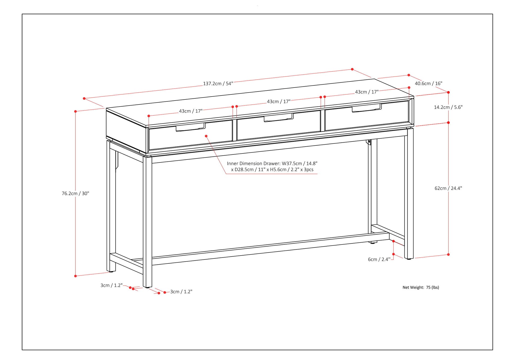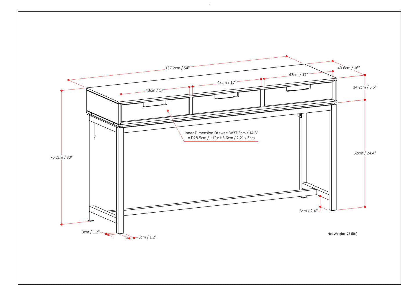 - Dimensions: 16.5" d x 54" w x 30" h