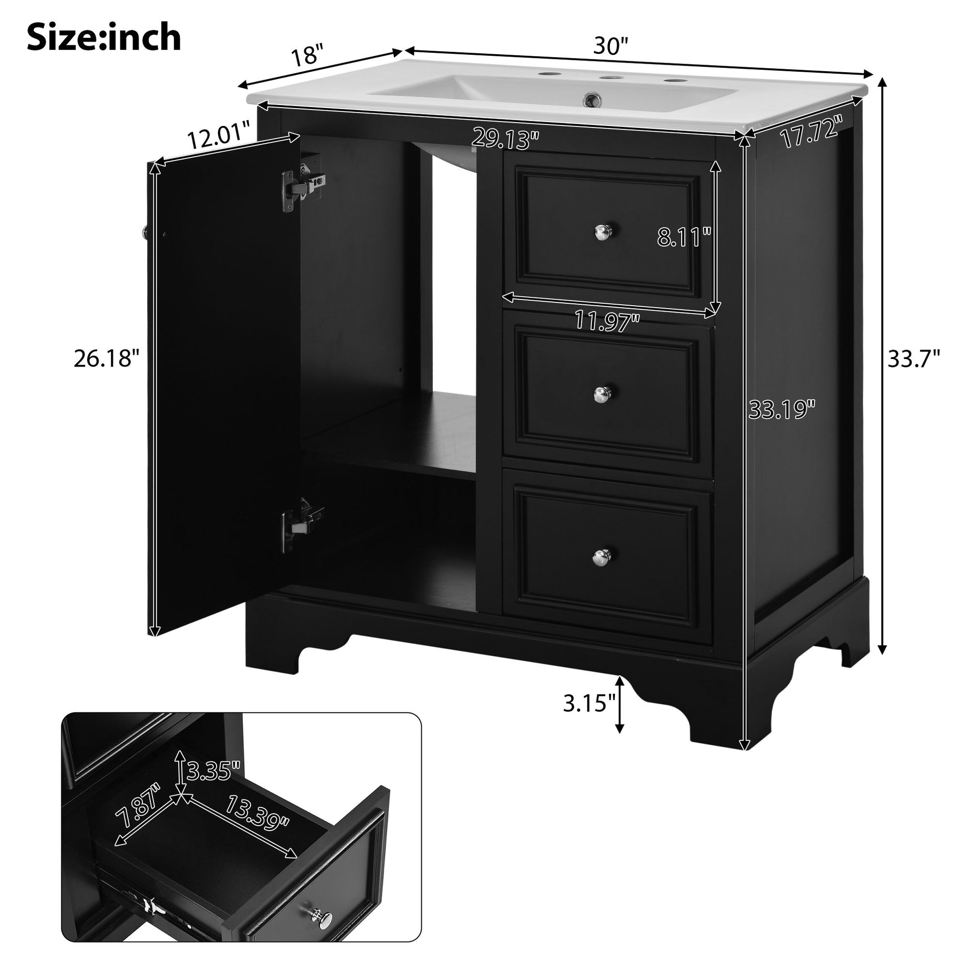 Bathroom Vanity Cabinet With Ceramic Basin, 3 Drawers And Adjustable Shelves - Black