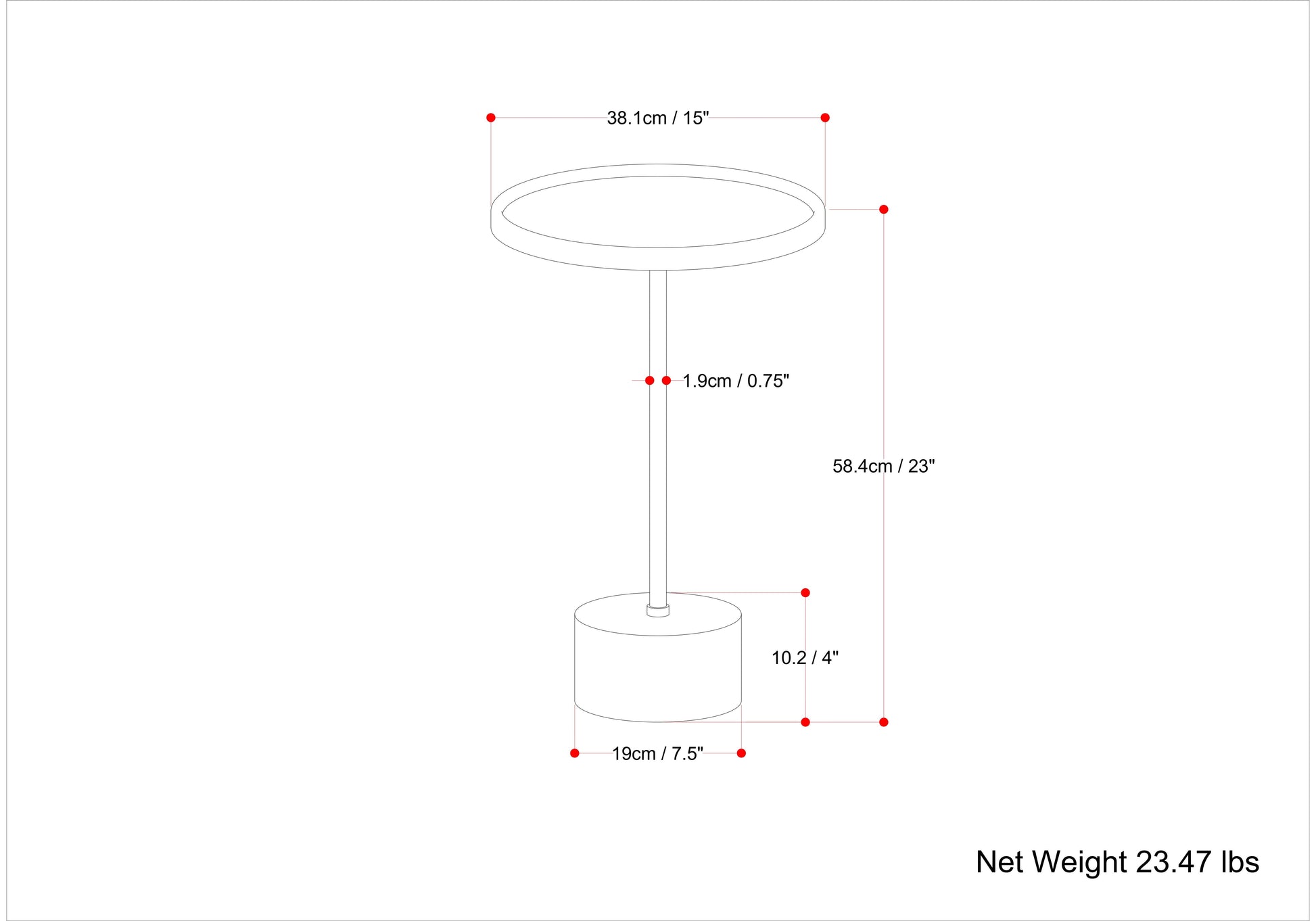 - Features round solid acacia top, antique brass look stem and solid white marble base