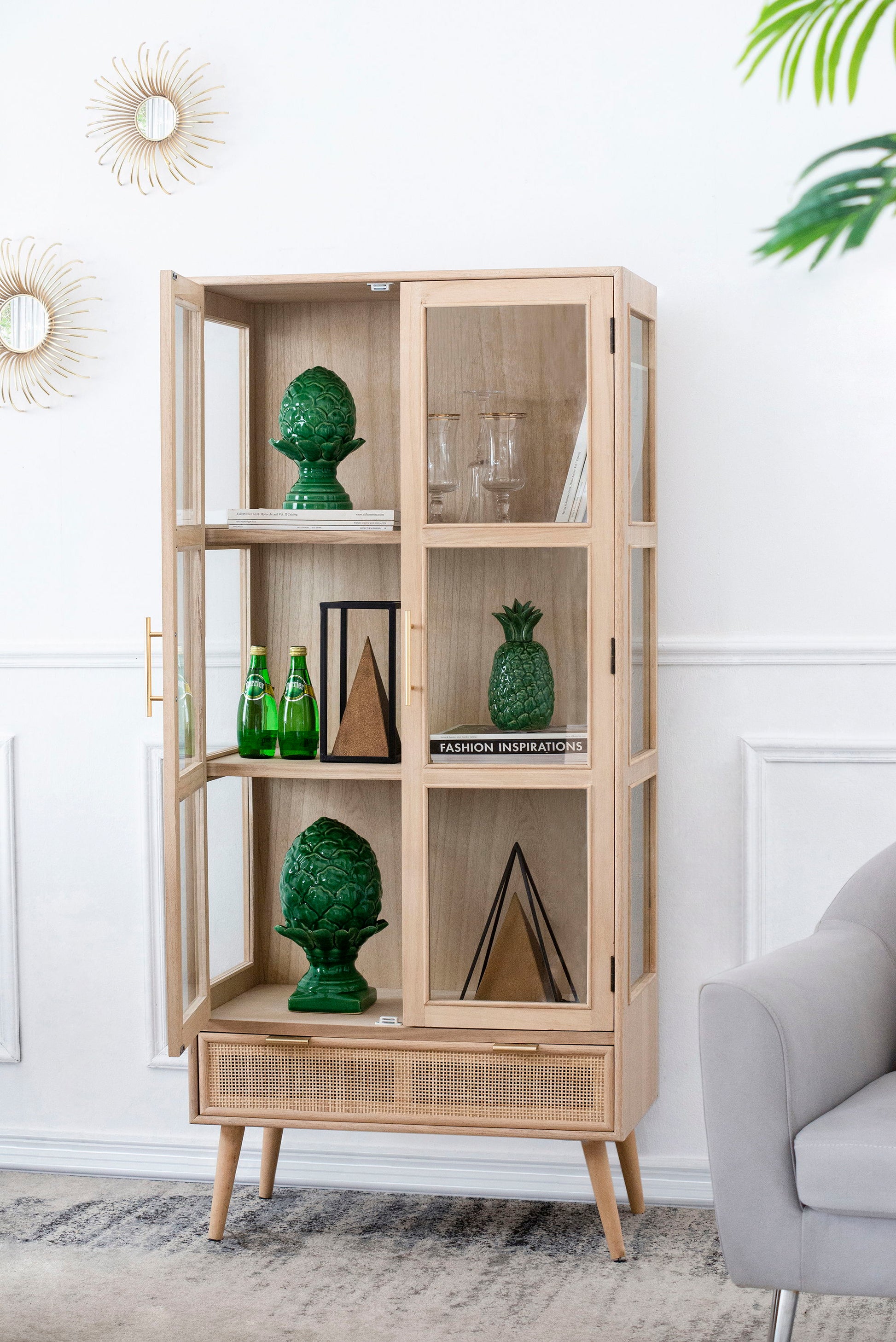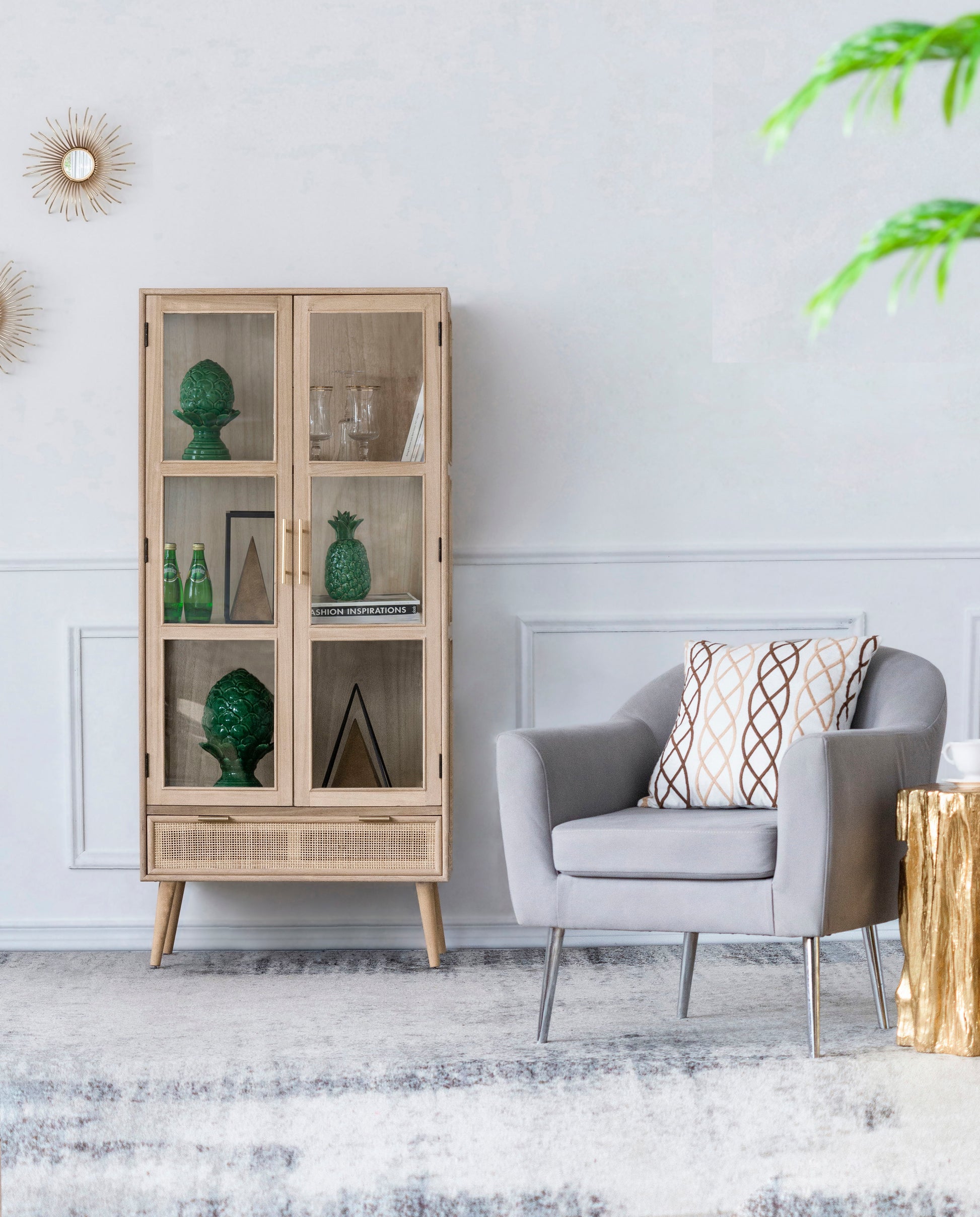 - Material Composition: Made from 70% MDF, 15% pine wood, 10% glass, and 5% rattan, ensuring durability and style.