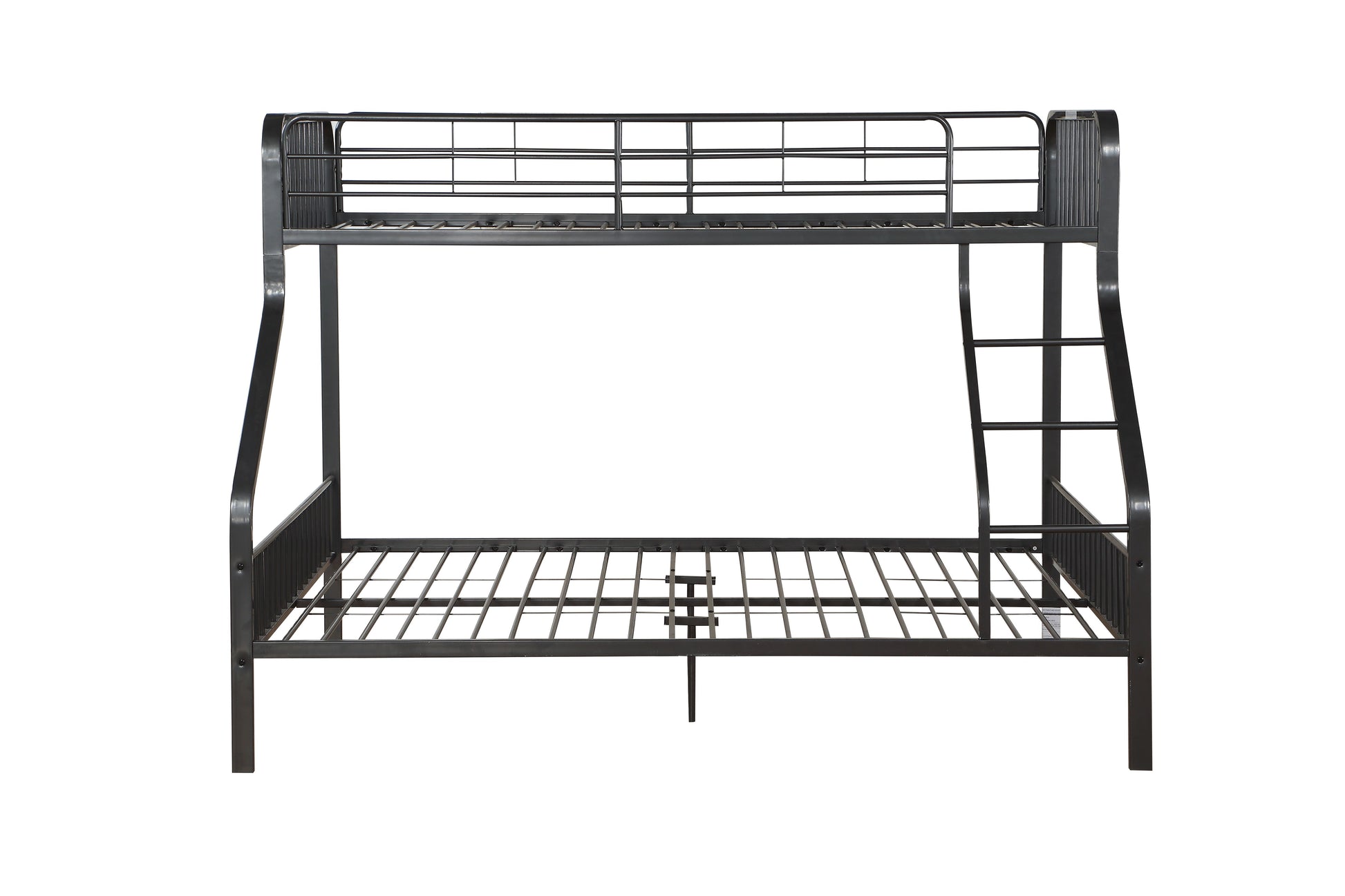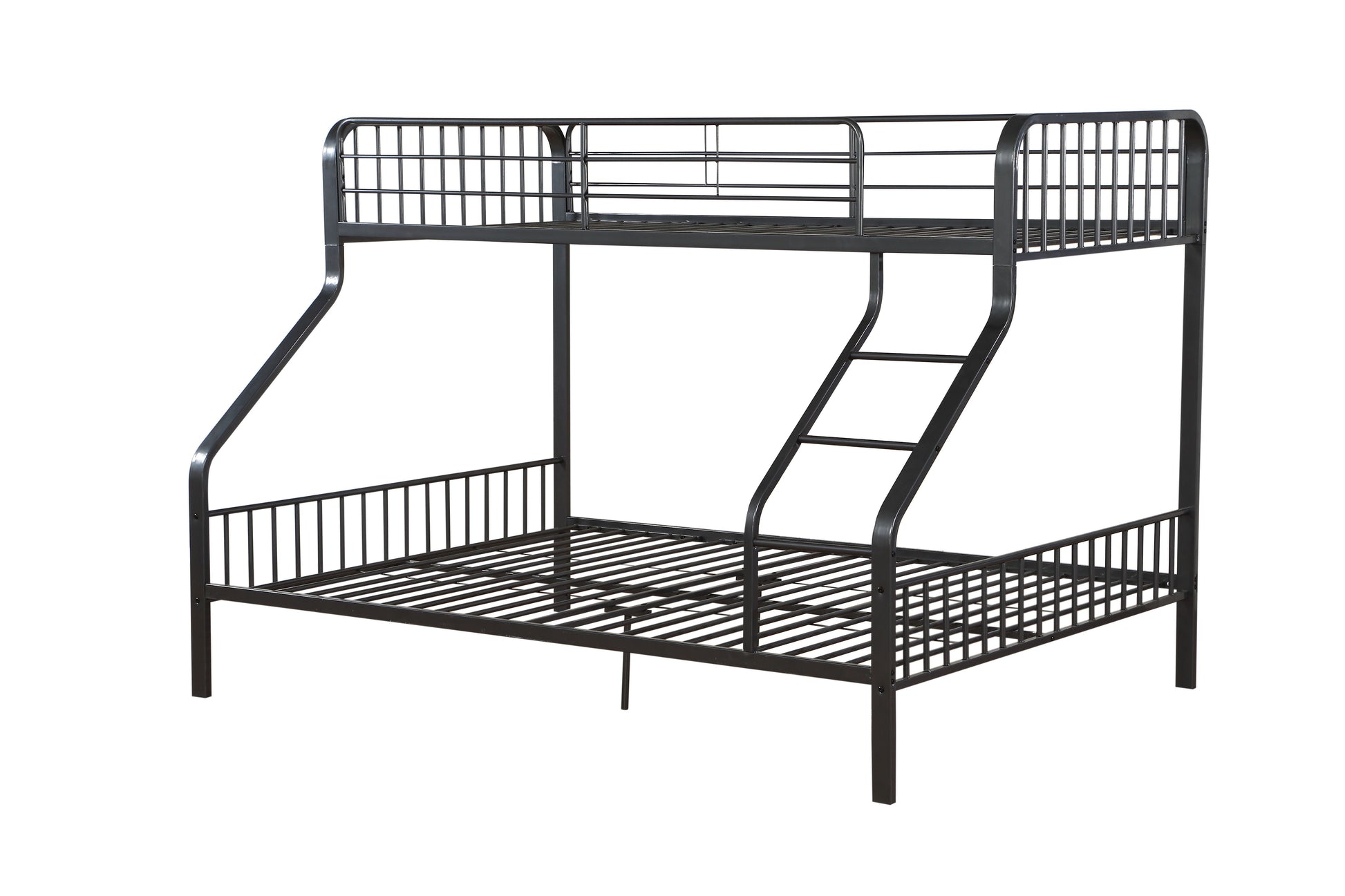 - Design and Structure: The Caius Gunmetal Finish Twin XL/Queen Bunk Bed features a sturdy metal tube construction with a powder-coated steel tube frame. It is designed with a built-in RF front ladder and easy access guardrails for safety.