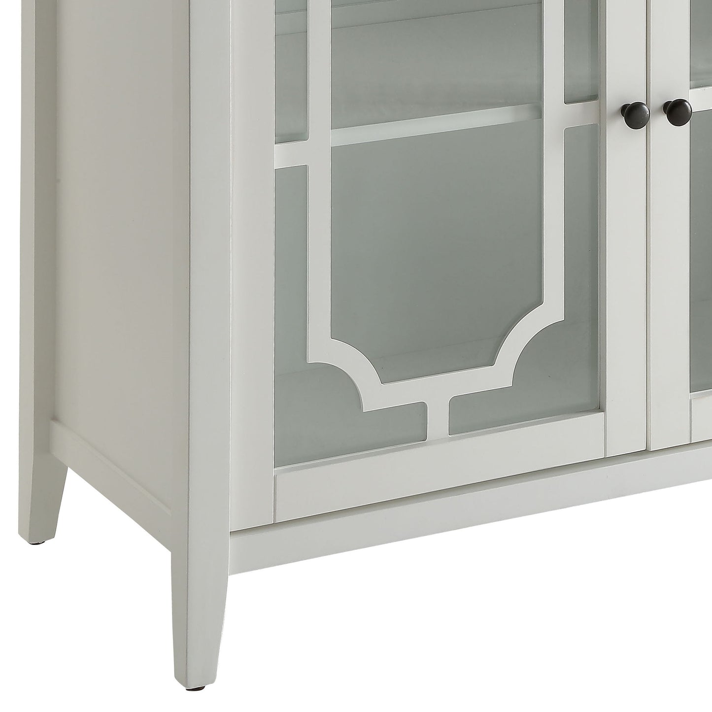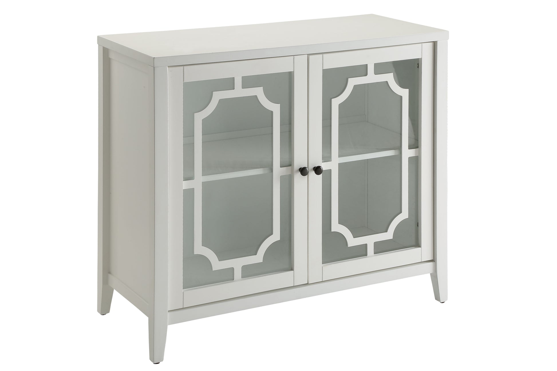 - Design and Structure: The Ceara White Finish Console Cabinet features a sleek rectangular design with two glass doors, providing an elegant aesthetic. It is supported by wooden tapered legs, offering a modern touch to any room.