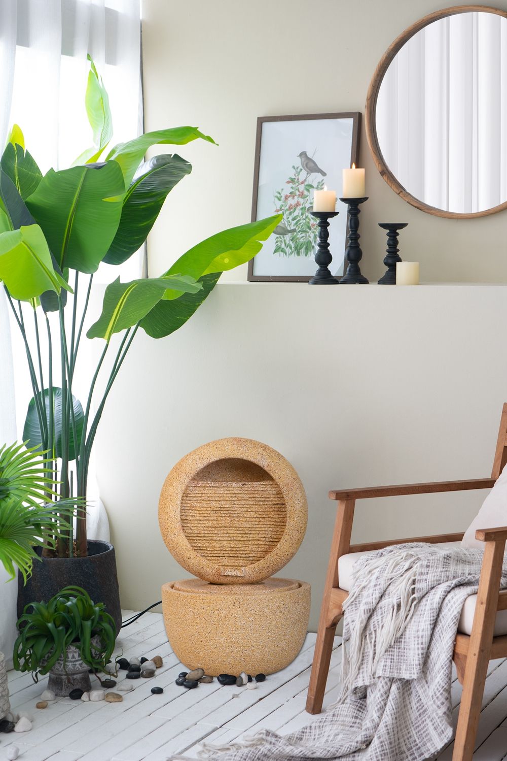 Cement Round Water Fountain With Light And Pump - Beige / Yellow