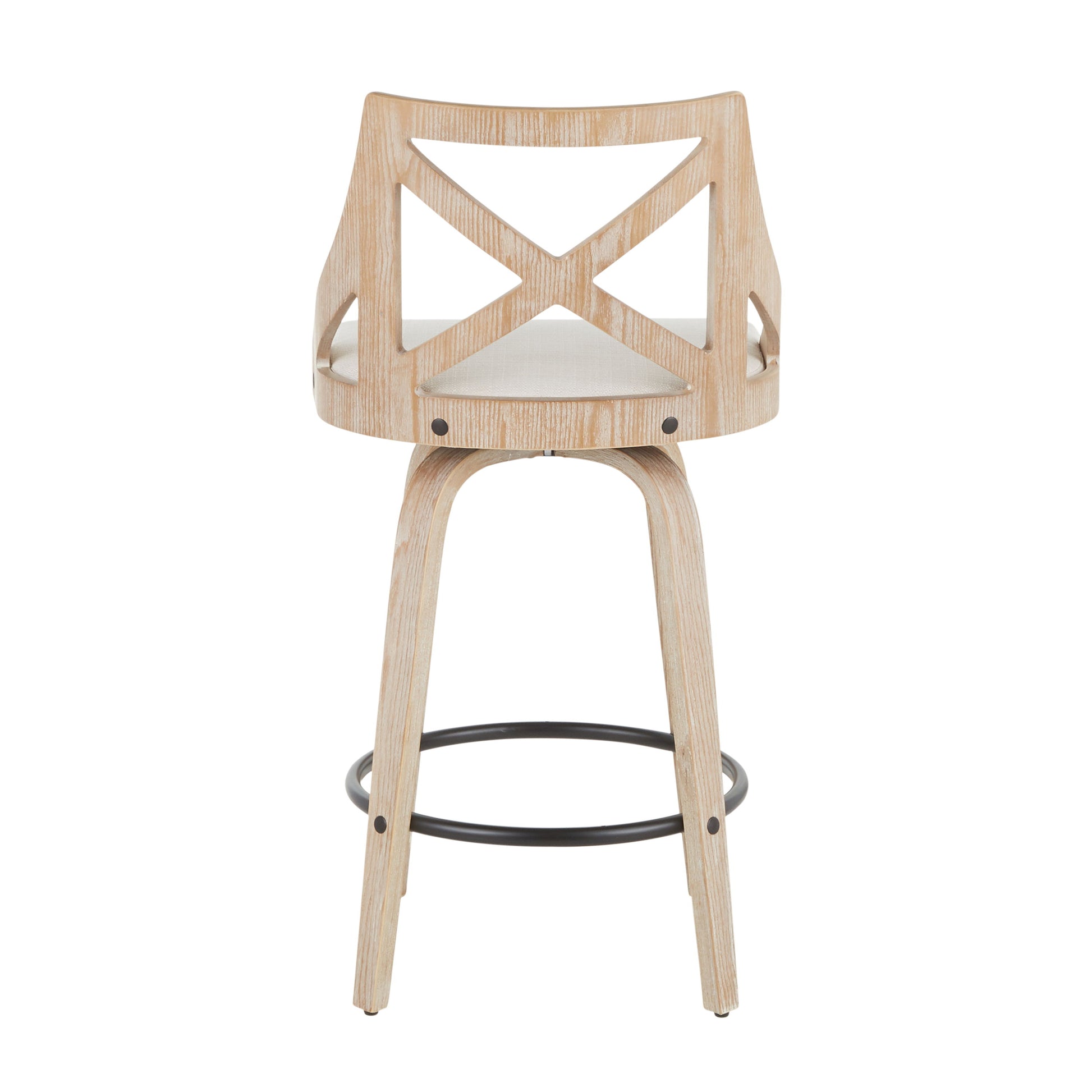 - Stylish Design: The Charlotte Counter Stool enhances any dining area with its elegant design, featuring a distinctive X-shaped accent on the backrest. Its white washed wood and fabric upholstery blend seamlessly to offer a transitional look that complements both traditional and farmhouse styles.