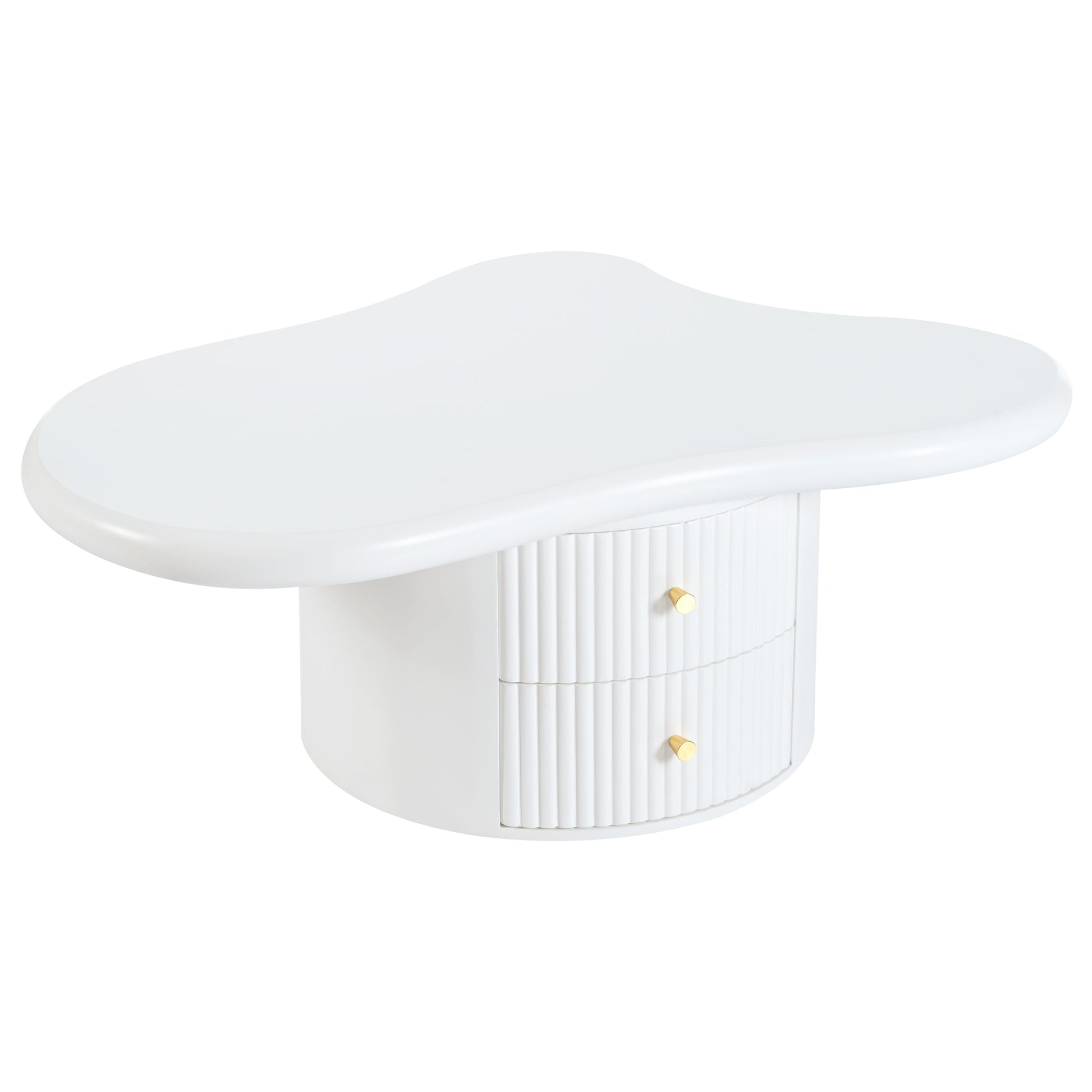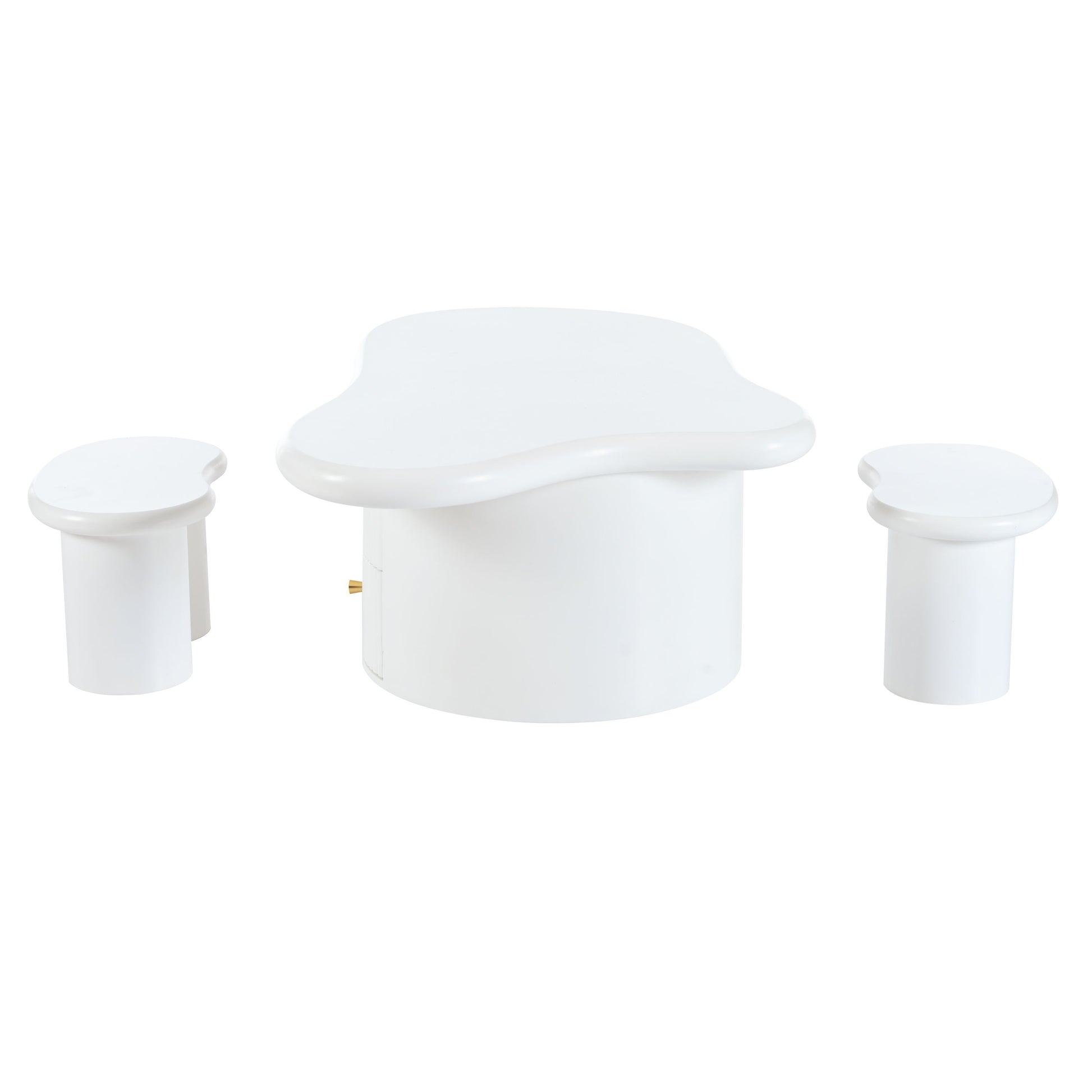 Cloud - Coffee Table (Set of 3), Irregular Shape Coffee Table With 2 Drawers, 2 Small Stools For Living Room - White