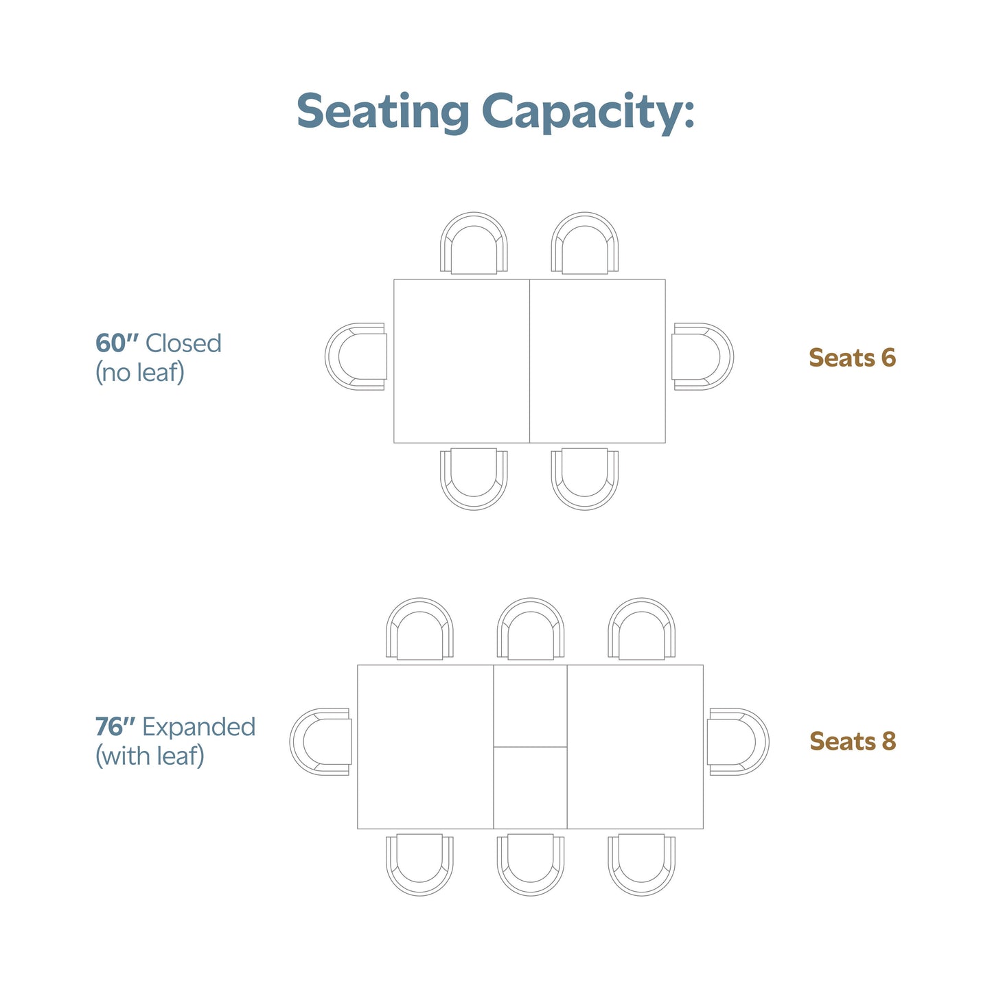 - This contemporary-style expandable dining table has a concealed butterfly leaf built into the tabletop that extends the length of the table from 60 inches to 76 inches; it accommodates up to 6 people when closed and up to 8 people when open, supports up to 200 lbs, and has a 25.5-inch leg clearance, from the floor to the table apron.