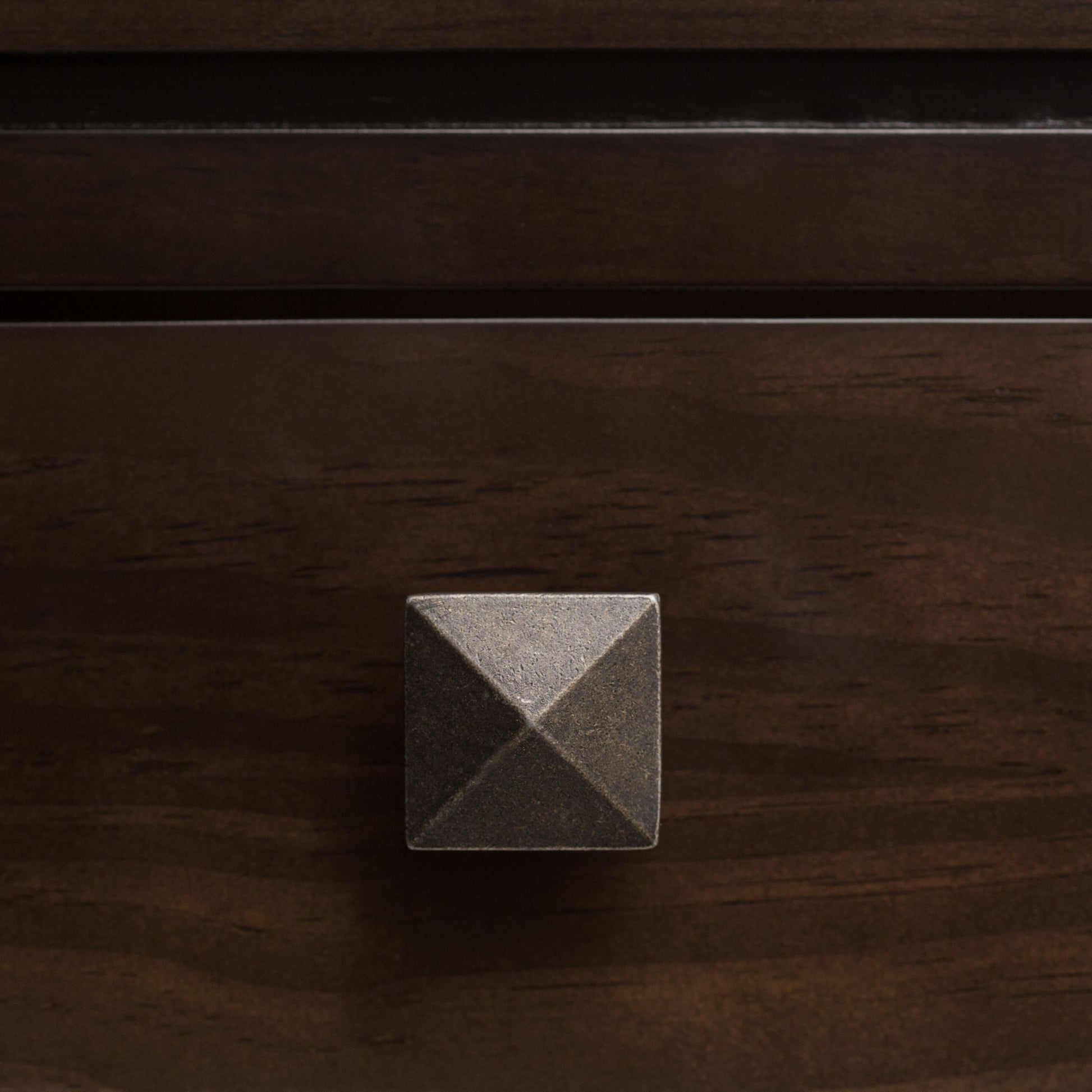 - Contemporary design includes floating square edged top, square knobs with peaked top and Bronze finish and square tapered legs.