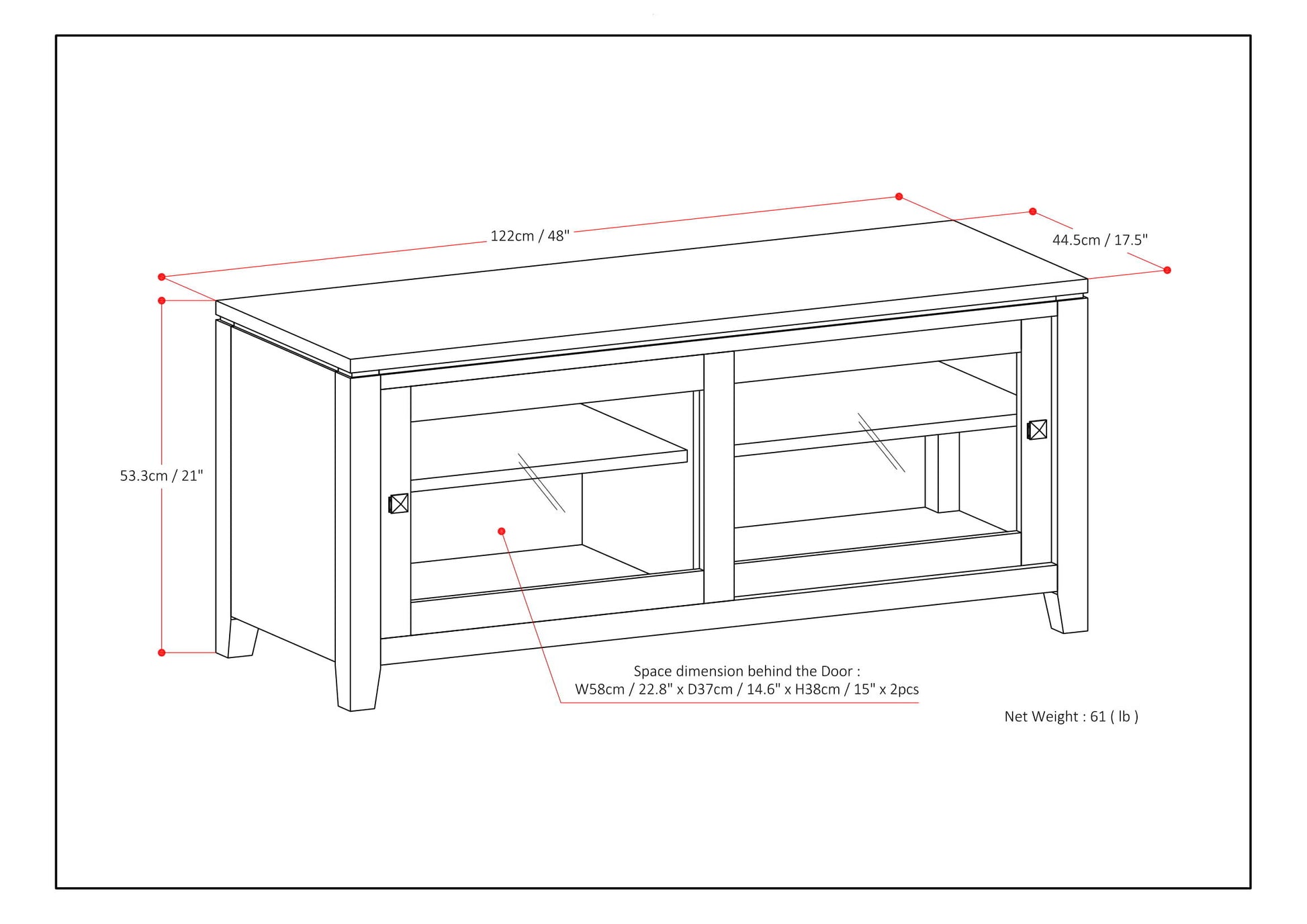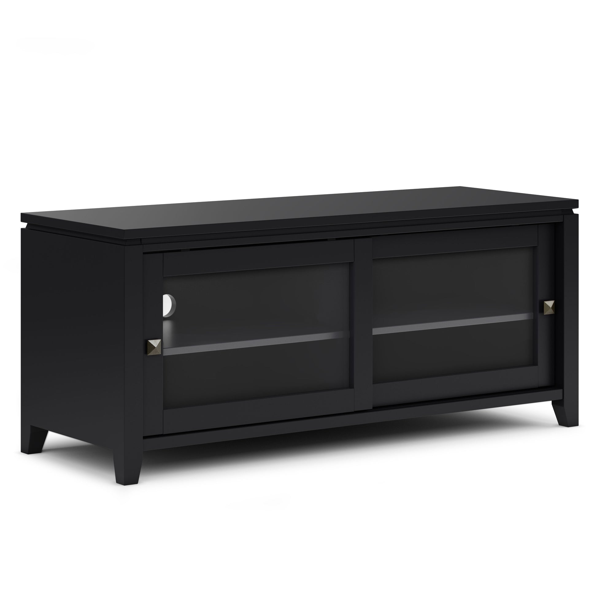 - Features two (2) sliding tempered glass doors that open to a cabinet with two (2) adjustable shelves