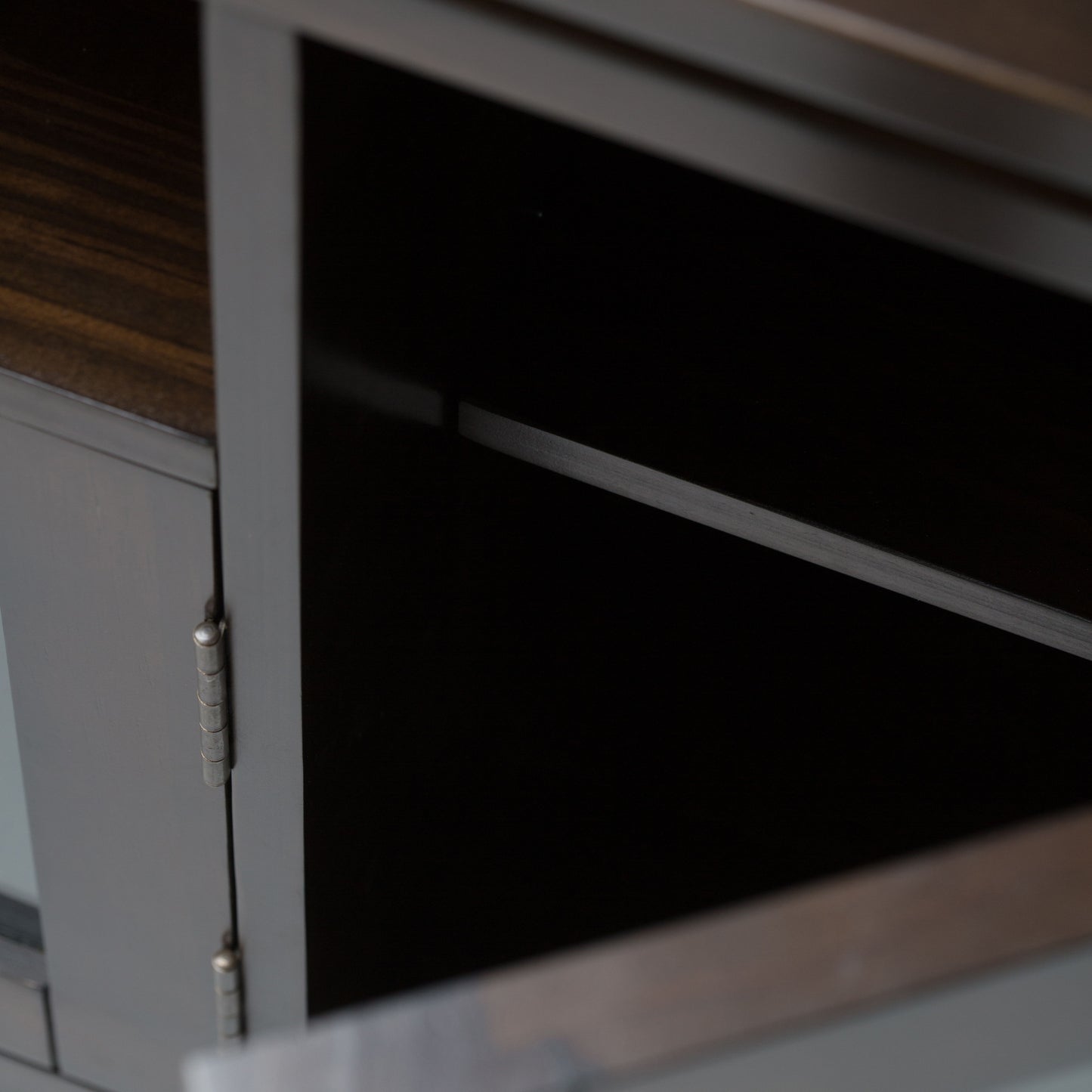 - Features a large centrally located open area with one (1) flip down drawer, one (1) pull out drawer as well as four (4) storage spaces with tempered glass doors