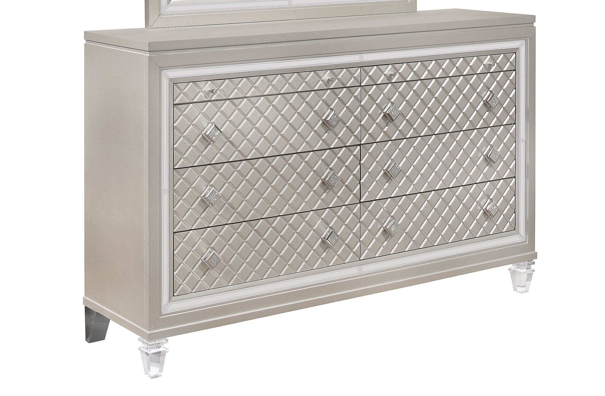 - Elegant Design: The CROSS GLAM CHAMPAGNE DRESSER features a sophisticated design with acrylic front legs and jewel embellished hardware, adding a touch of glamour to any bedroom decor.
