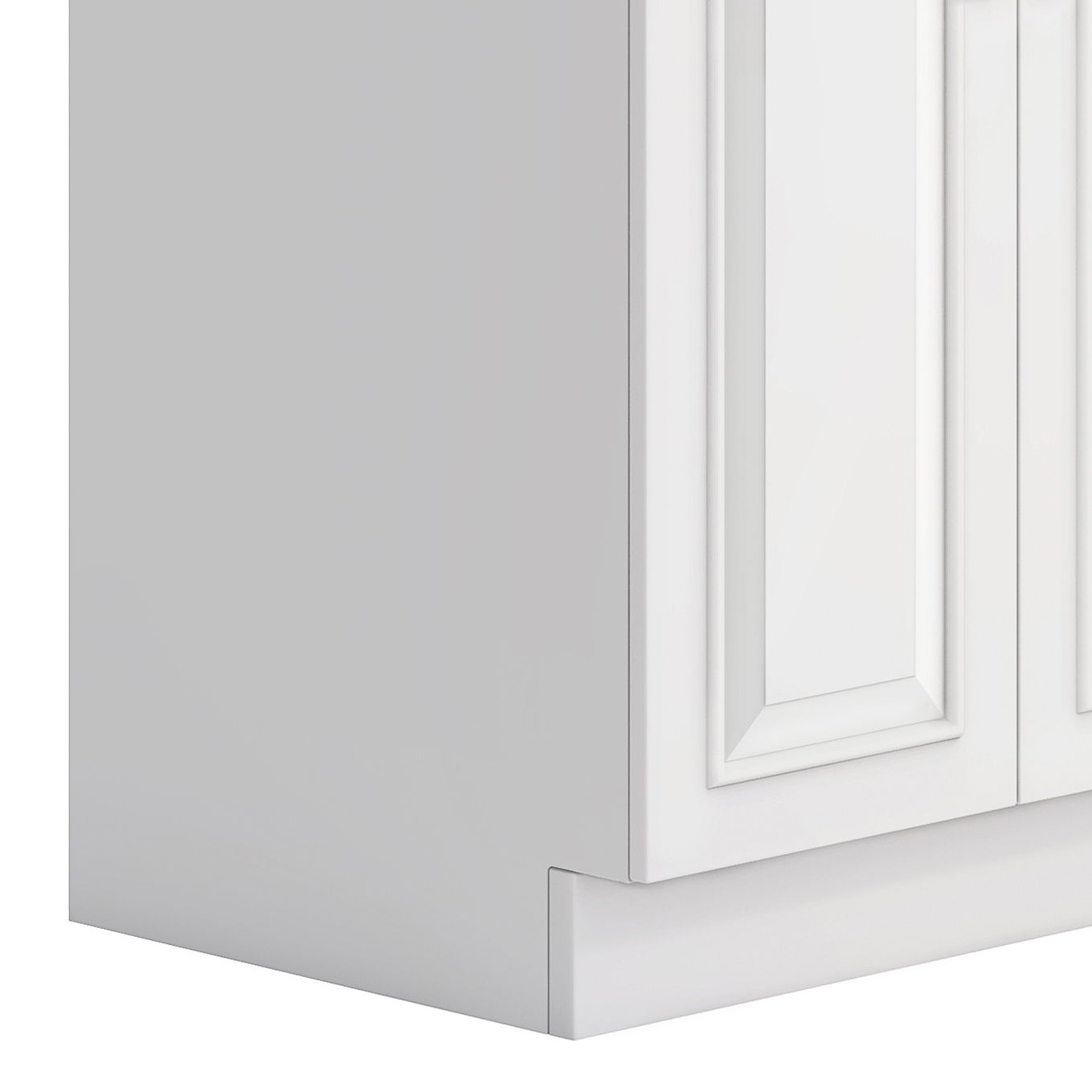 - Cabinet is constructed with melamine and doors are wrapped with PVC, materials that are highly durable, low maintenance, and water resistant
