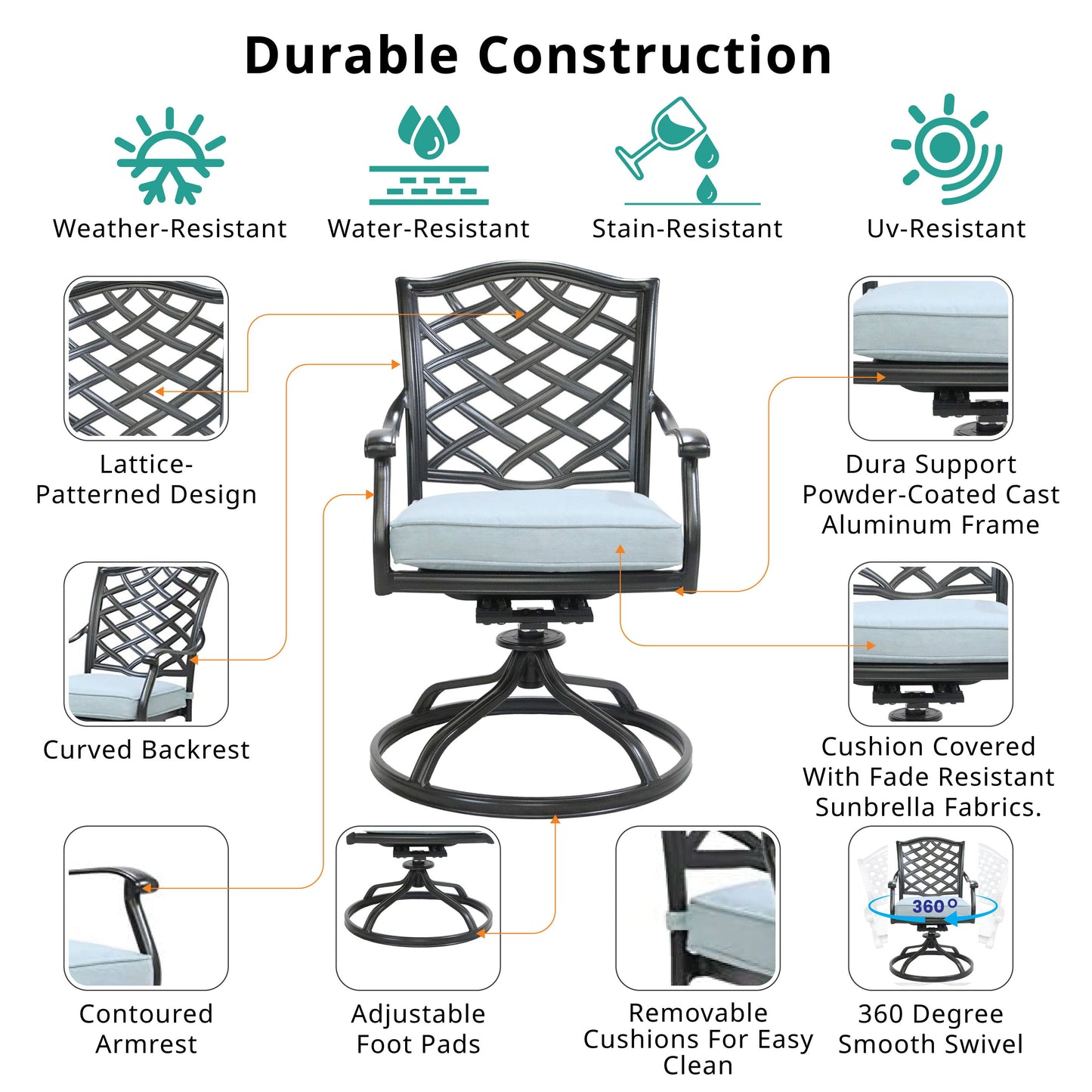 - LONG-LASTING DURABILITY: Crafted from high-quality, weather-resistant aluminum, these patio dining swivel chairs are built to withstand the elements and ensure long-lasting performance.