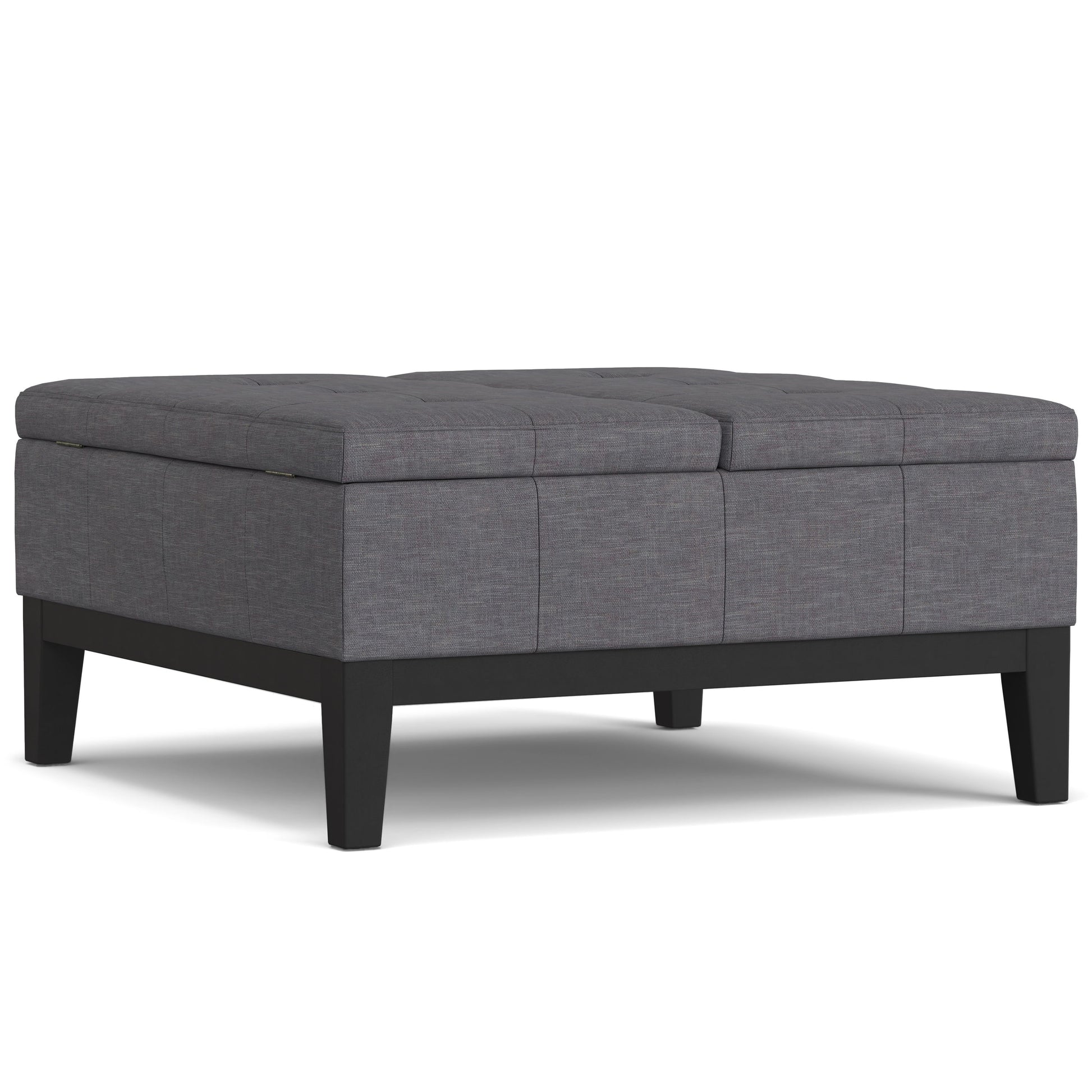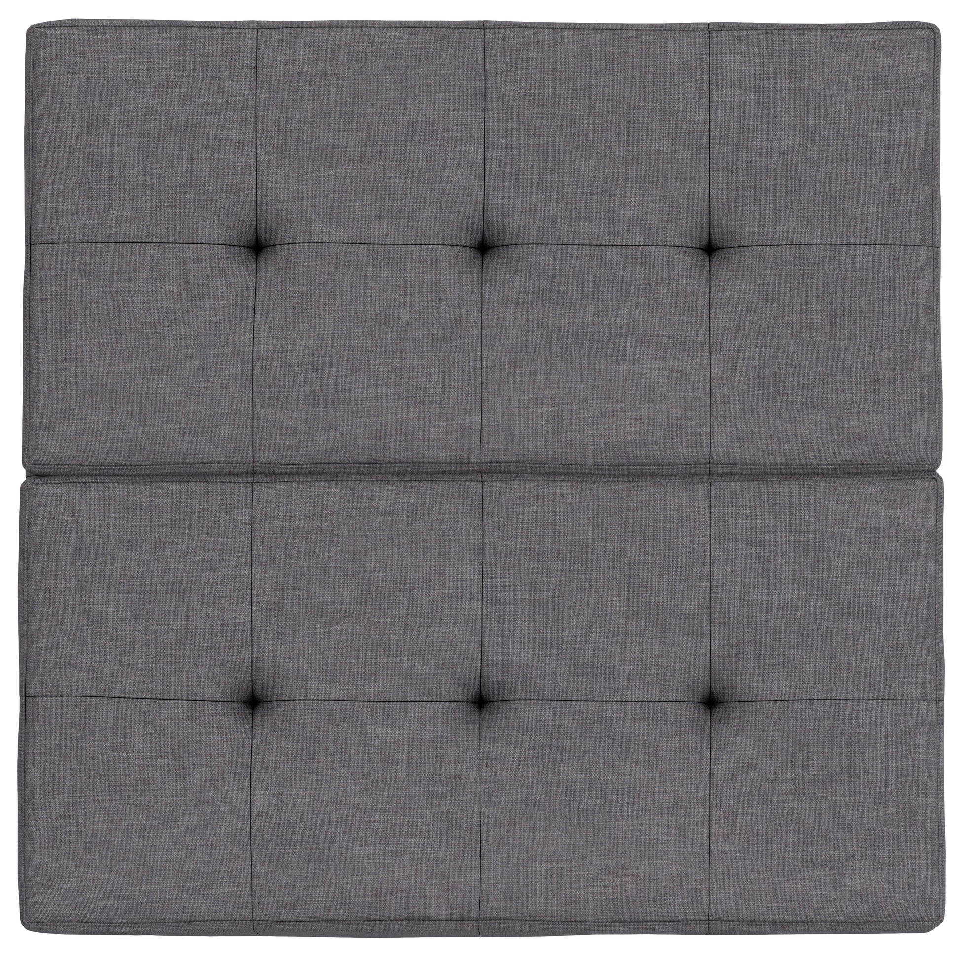 - Upholstered with a durable Slate Grey Linen-Style fabric with square tufting.