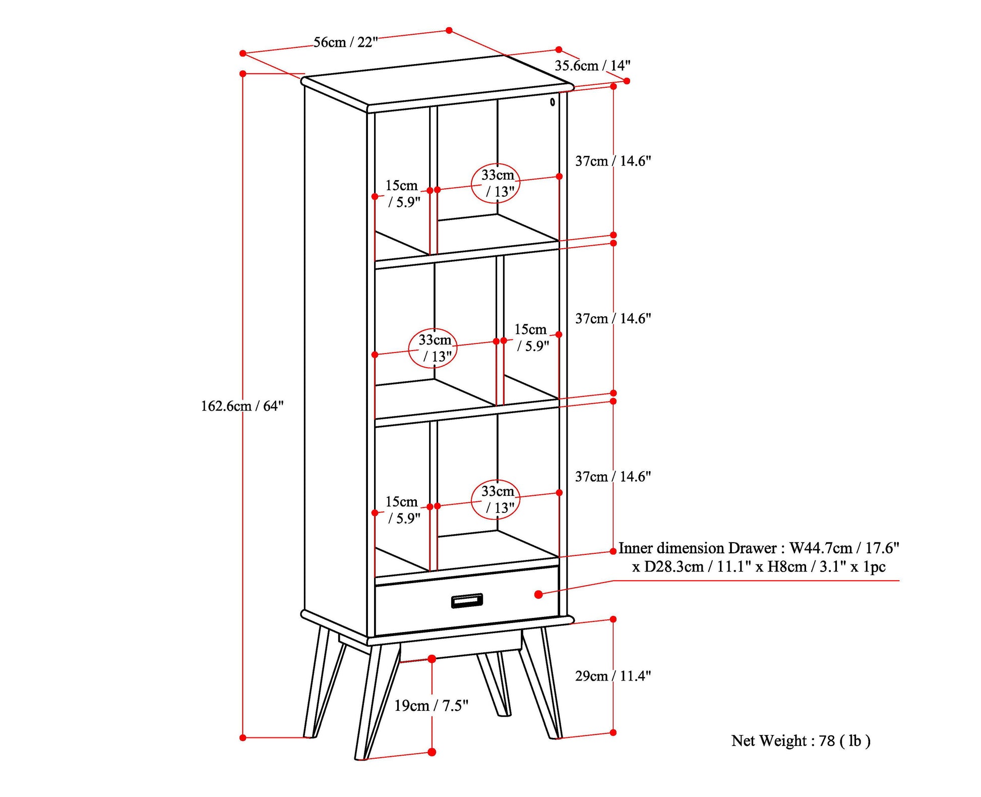 - Features six (6) shelving compartments and a drawer for storage with recessed drawer pull in an antique brass hardware finish and anti-tip hardware