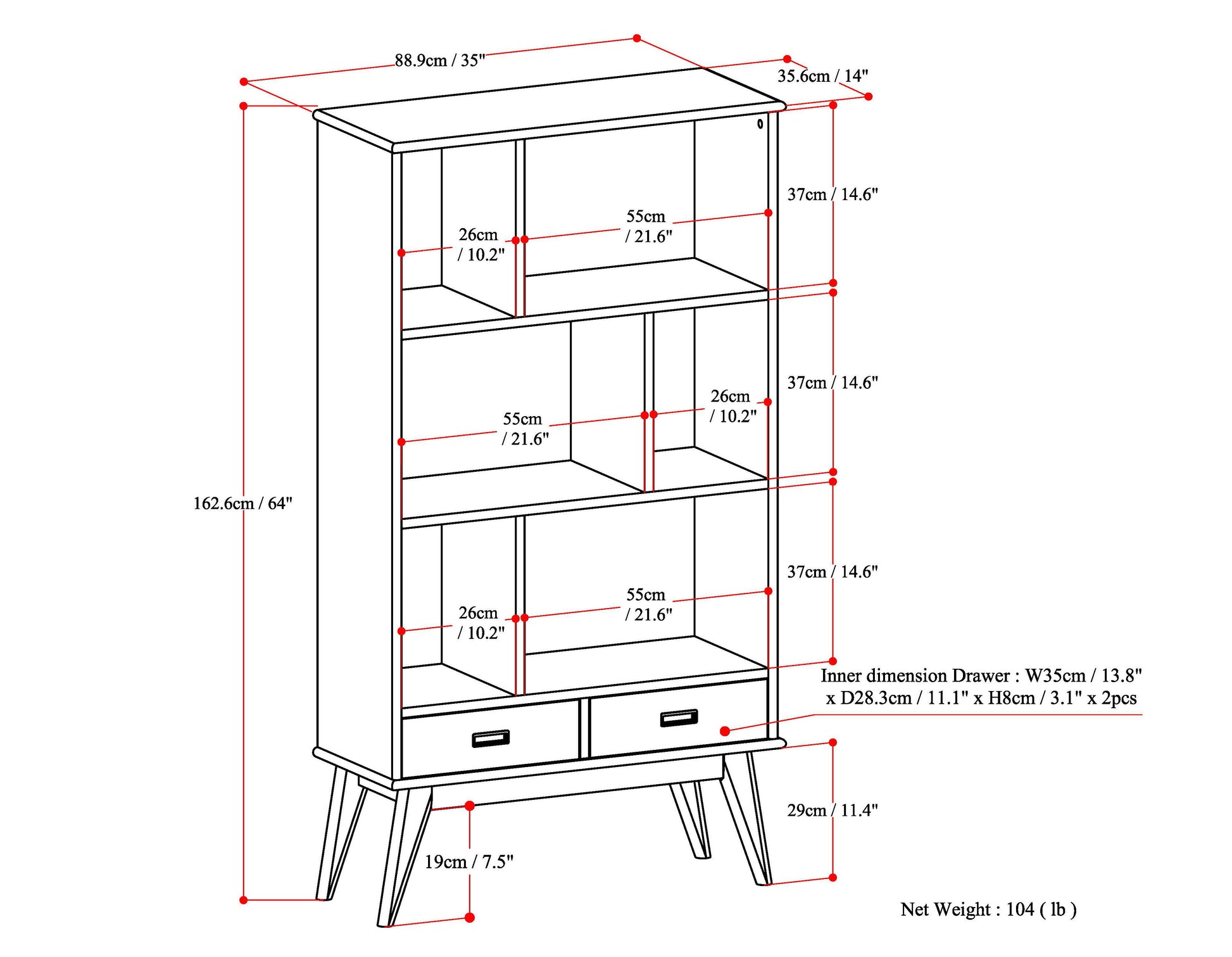- Features six (6) shelving compartments, two bottom drawers with recessed drawer pulls in an antique brass hardware finish and anti-tip hardware