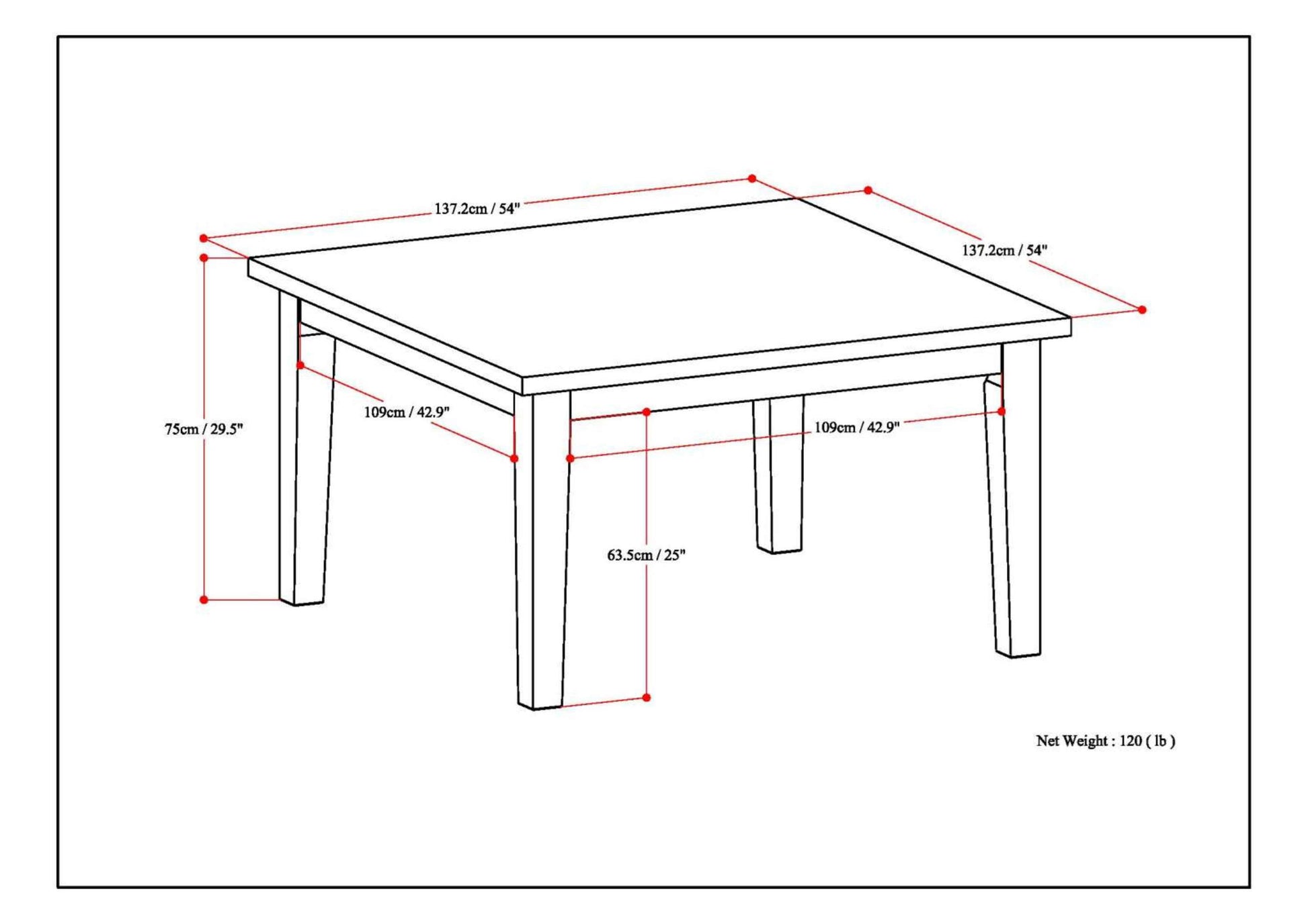Measuring 54-inches square, this handcrafted, contemporary-style dining table comfortably accommodates up to 8 people and supports up to 180 lbs; it has a 25-inch leg clearance, from the floor to the table apron.