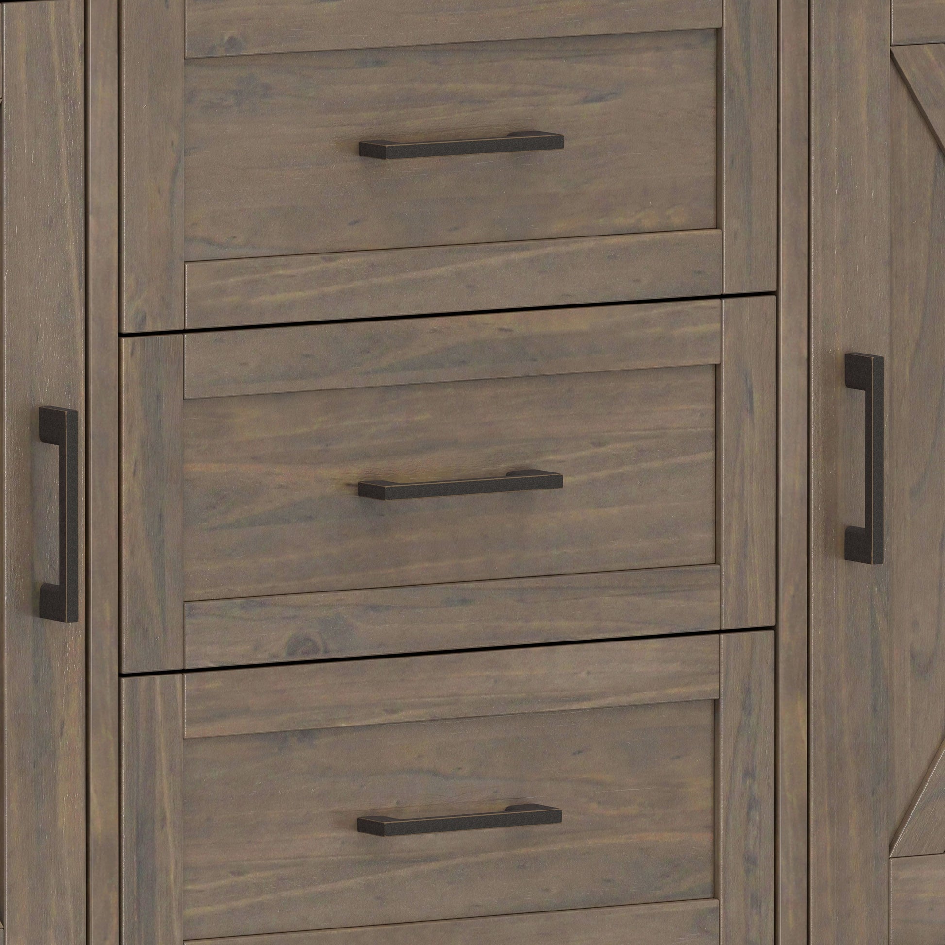 - Features four (4) central and two (2) side drawers with metal glides, and two (2) side doors that open to large storage spaces with one (1) shelf each.